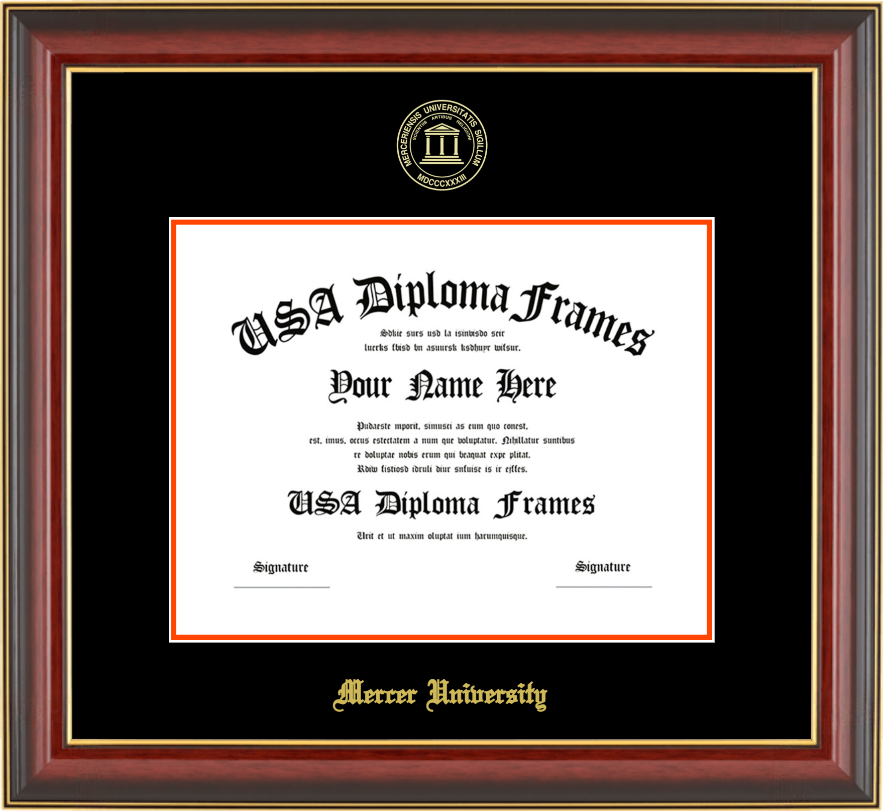 Mercer University – Single Horizontal Document ( Bachelors/Masters ) – Cherry Mahogany Gold Trim Glossy – Black Mat – Orange Accent Mat – With Seal(University Seal Gold) – With Gold Embossing (Mercer University)