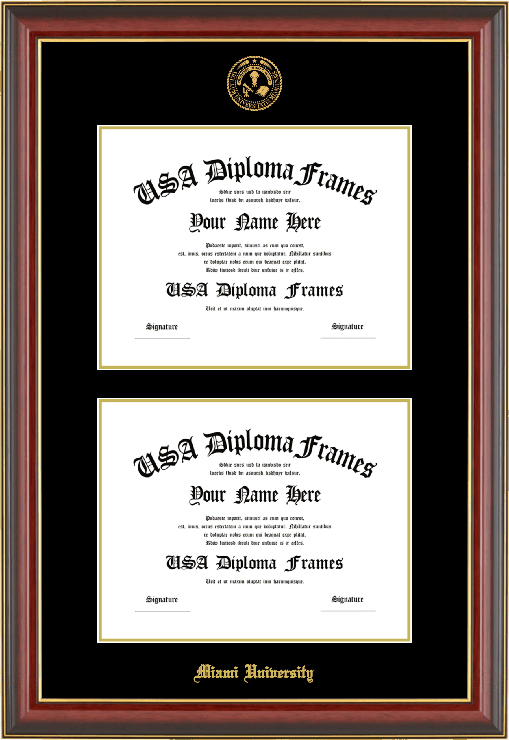 Miami University Ohio Double Diploma Frame – Double Document – Cherry Mahogany Gold Trim Glossy – Black and Gold Mat