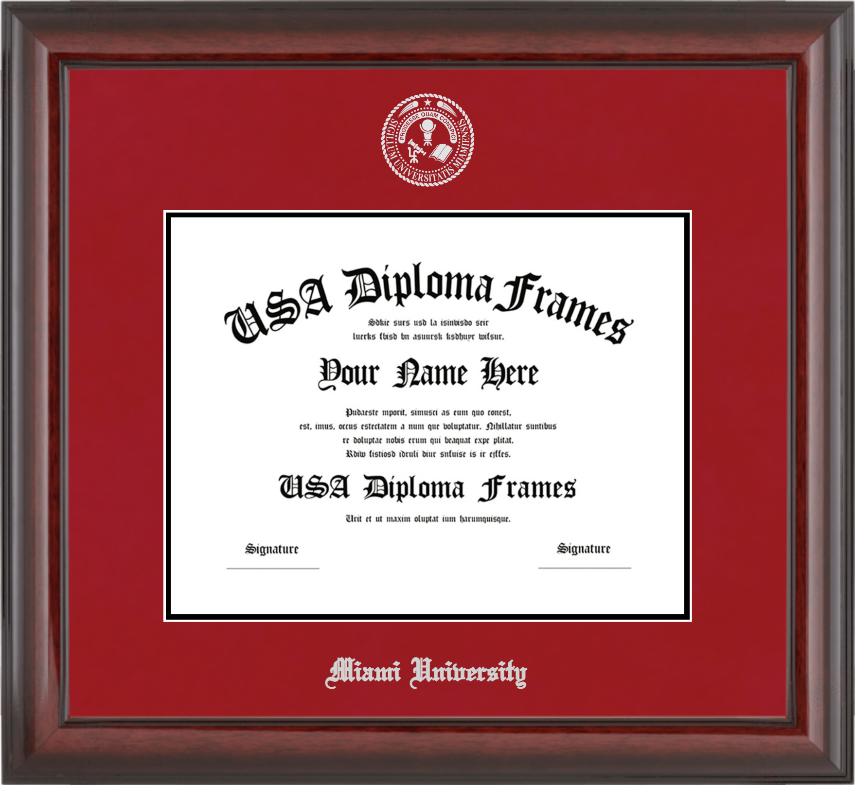 Miami University (OH) – Single Horizontal Document ( Bachelors/Masters ) – Cherry Mahogany Glossy – Crimson Mat – Black Accent Mat – With Seal(University Seal Silver) – With Silver Embossing (Miami University)