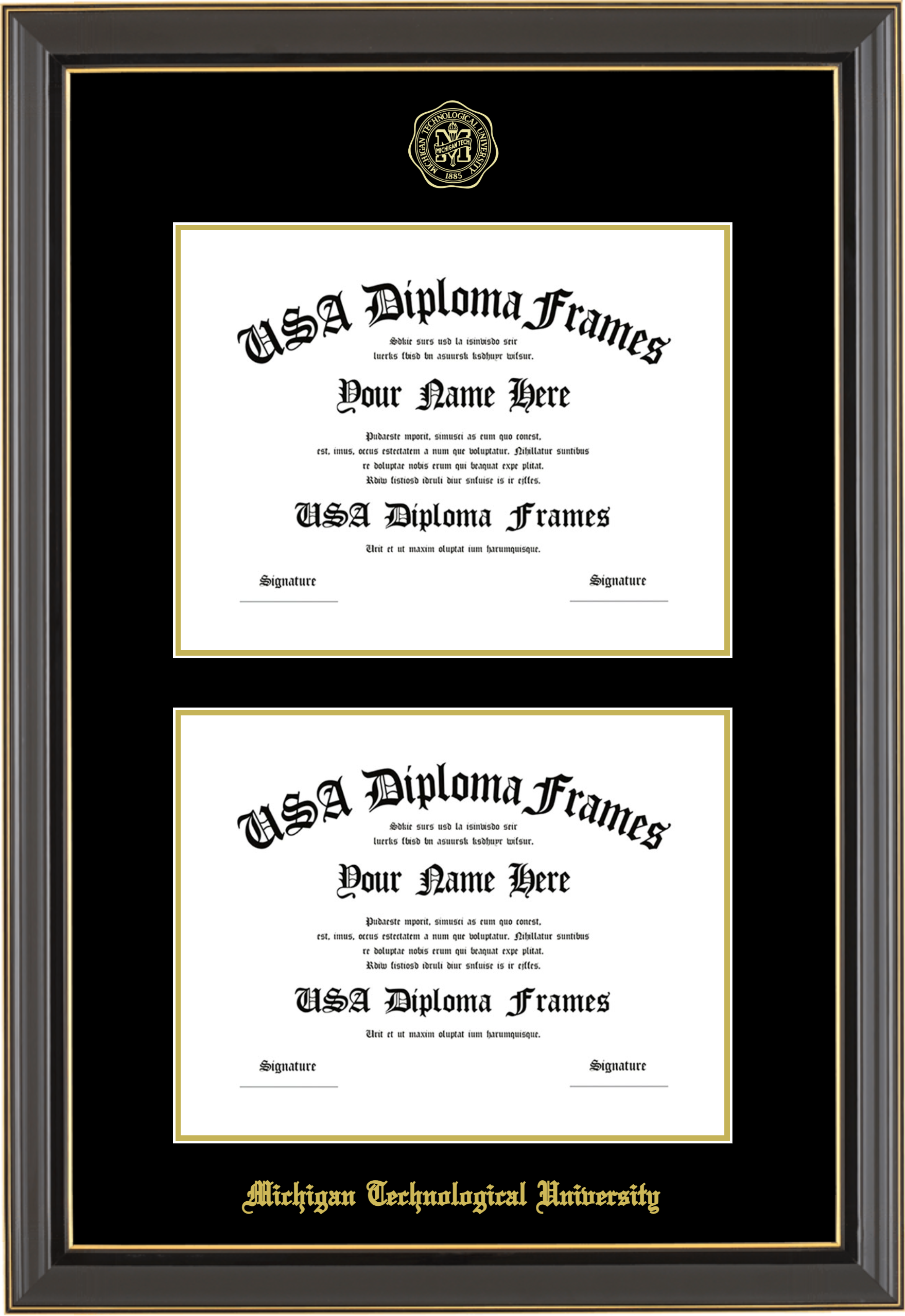 Michigan Technological University Double Diploma Frame – Double Document – Black Gold Trim Glossy – Black and Gold Mat