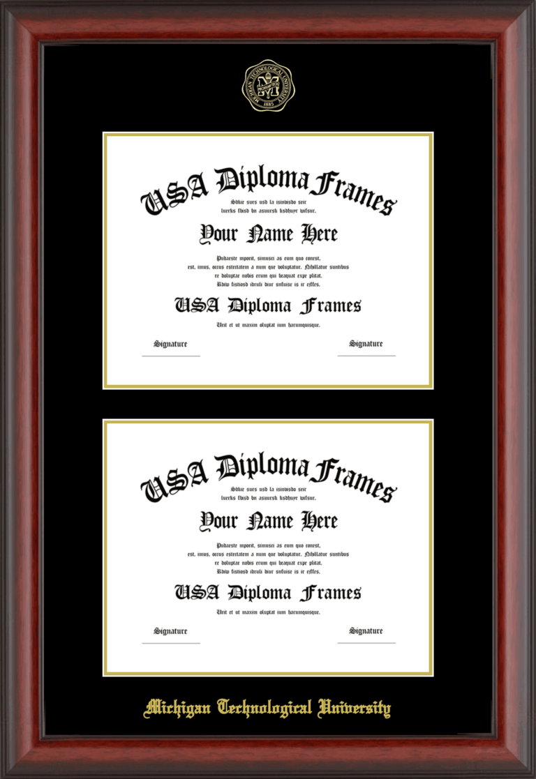 Michigan Technological University Double Diploma Frame – Double Document – Cherry Mahogany Matte – Black and Gold Mat