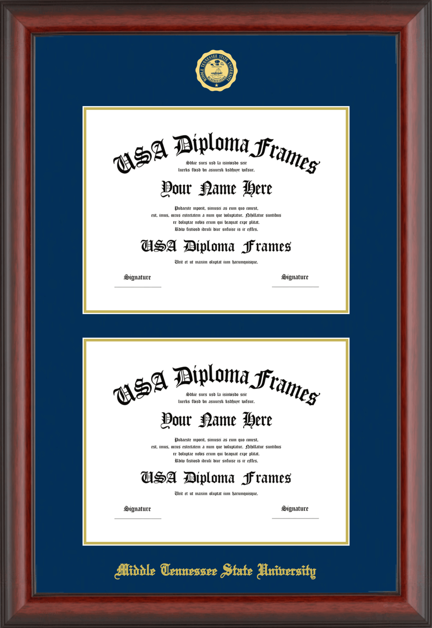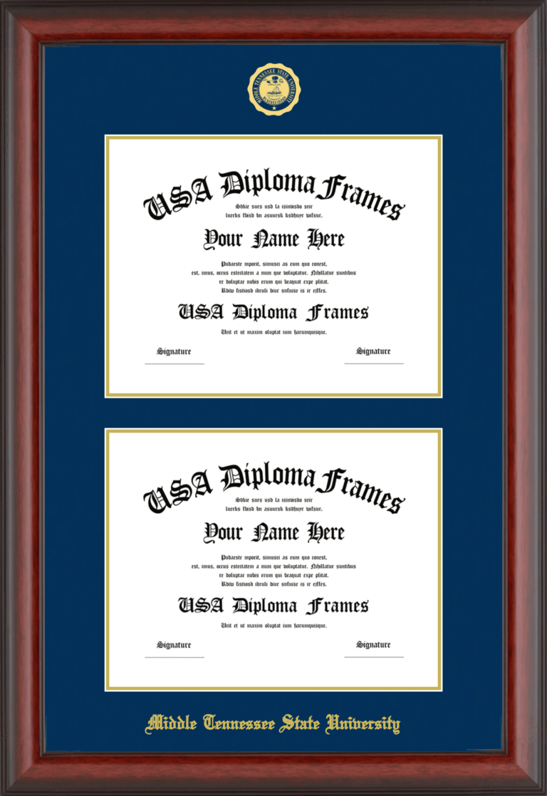 Middle Tennessee State University Double Diploma Frame – Double Document – Cherry Mahogany Matte – Navy and Gold Mat