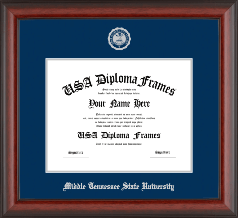 Want to explore more styles? Browse our full range of diploma frame layouts, or visit the Middle Tennessee State University to view options available for your school. Looking for a fully personalized design? Try our custom Frame Builder and create a frame that’s uniquely yours.