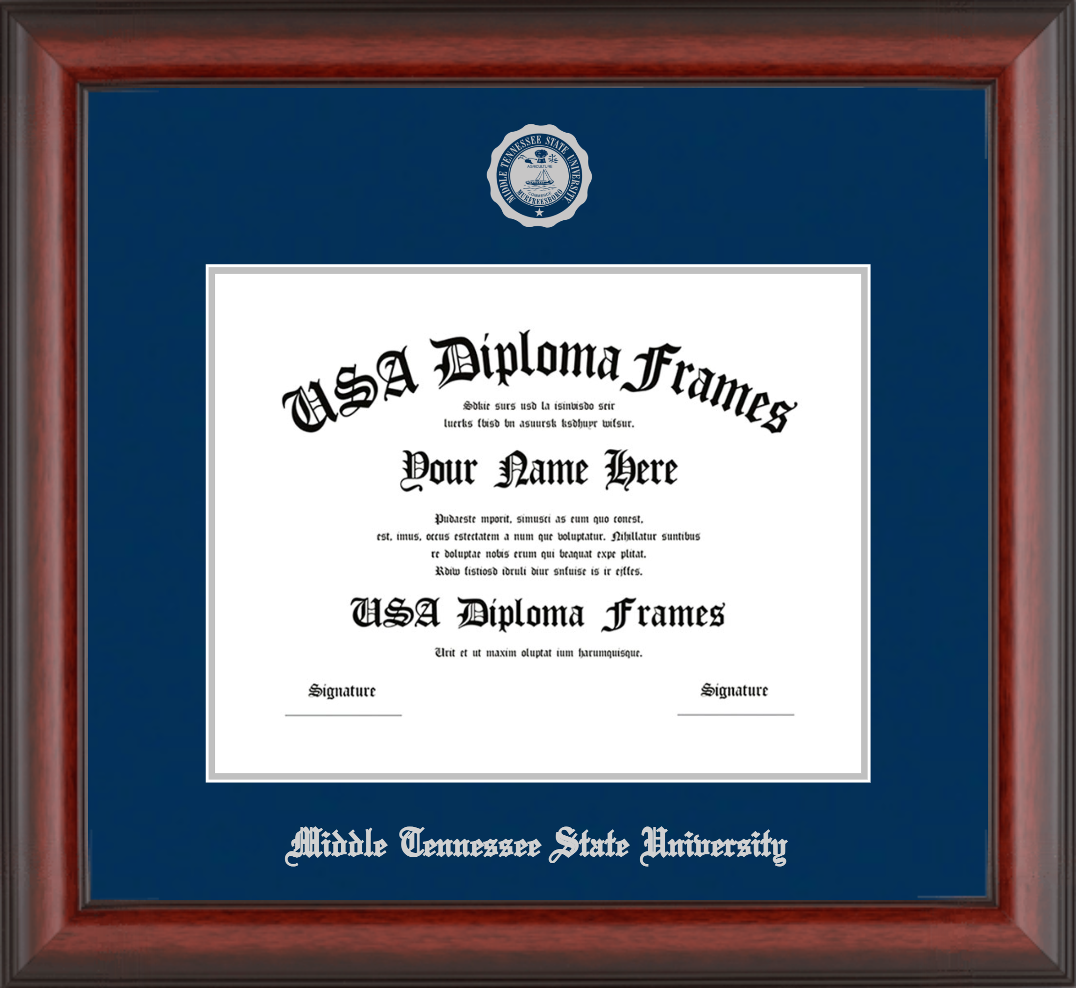 Middle Tennessee State University Diploma Frame – Cherry Mahogany Matte – Navy and Silver Mat