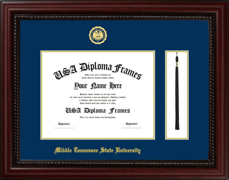 Want to explore more styles? Browse our full range of diploma frame layouts, or visit the Middle Tennessee State University to view options available for your school. Looking for a fully personalized design? Try our custom Frame Builder and create a frame that’s uniquely yours.