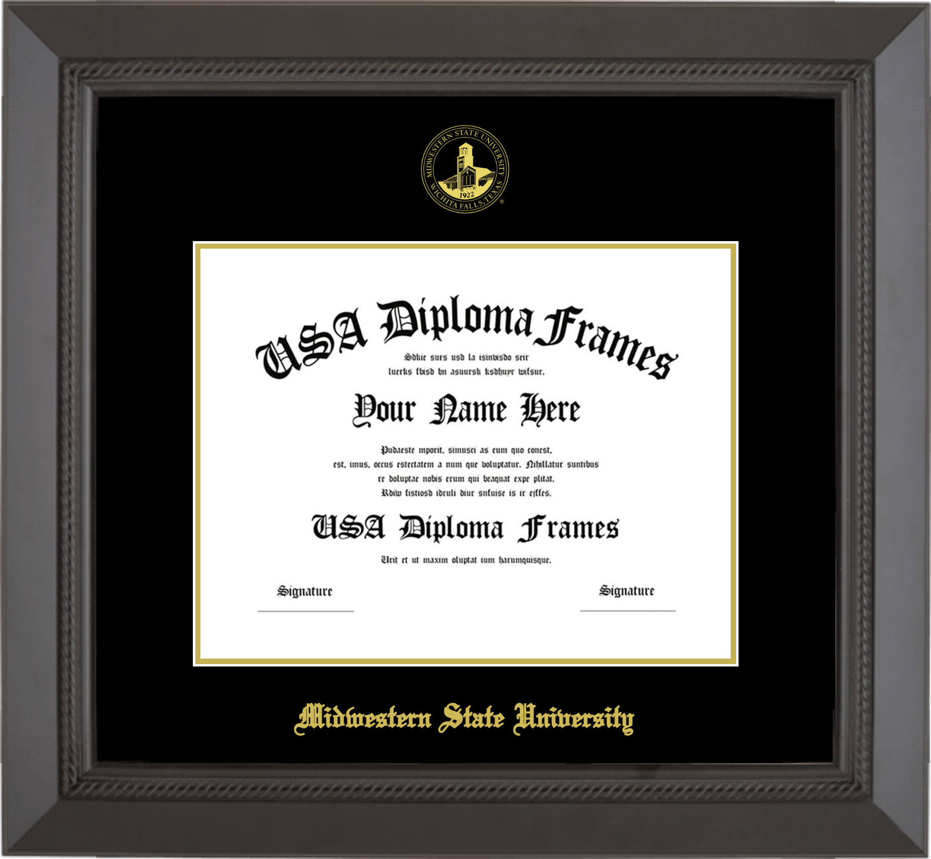 Midwestern State University Diploma Frame – Black Rope – Black and Gold Mat