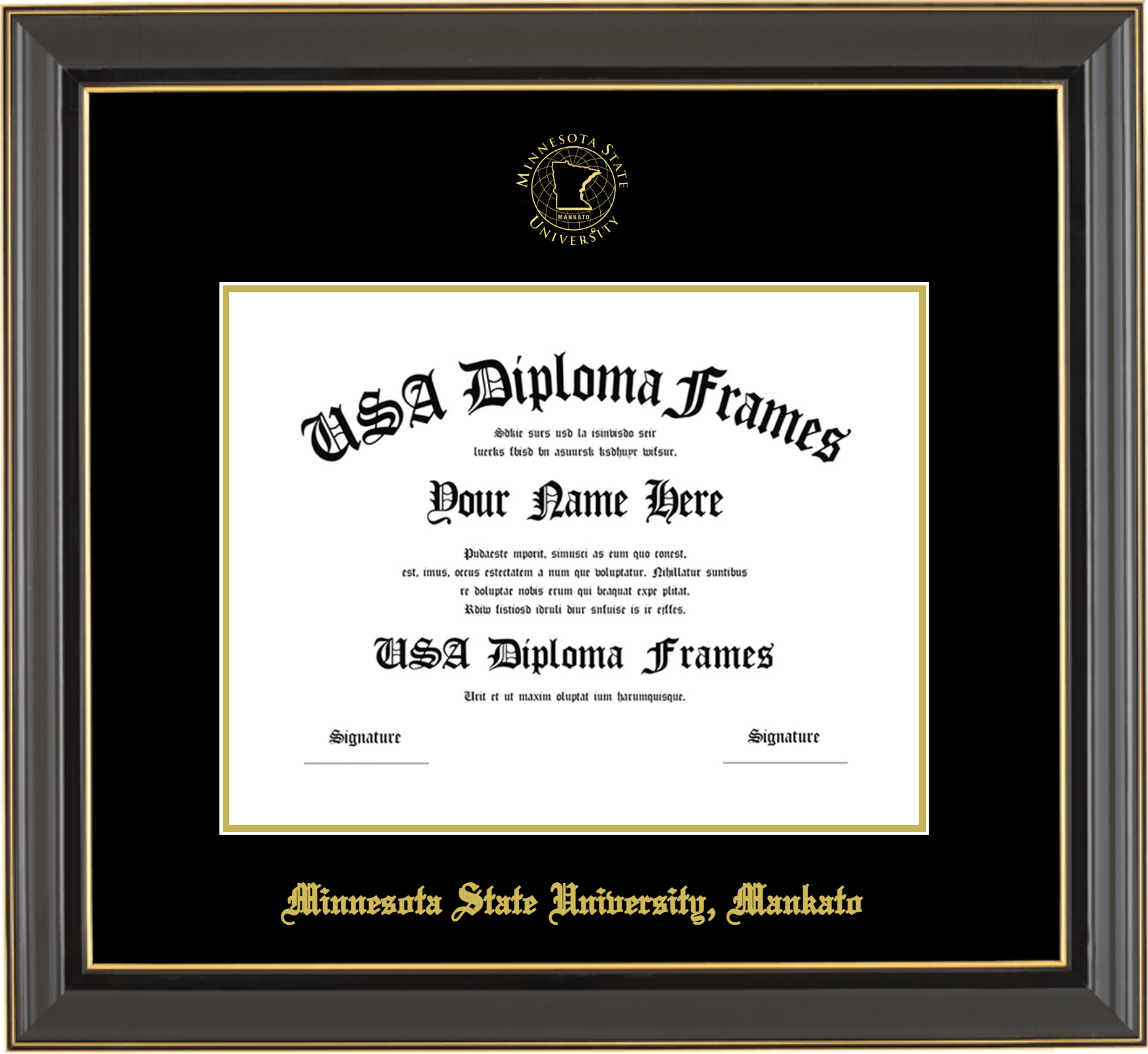 Minnesota State University Mankato Diploma Frame- Black Gold Trim Glossy – Black and Gold Mat