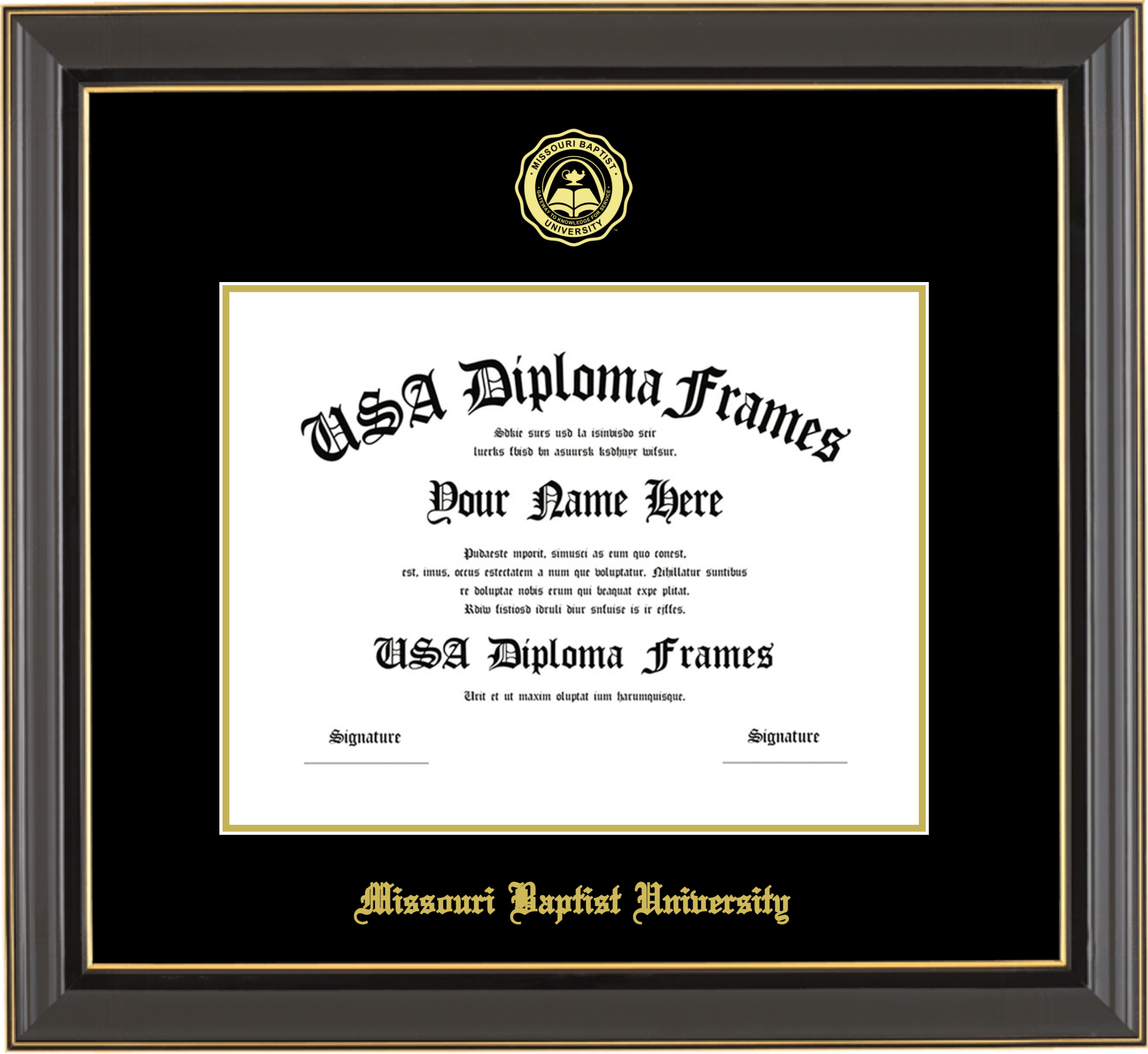 Missouri Baptist University Diploma Frame – Black Gold Trim Glossy – Black and Gold Mat