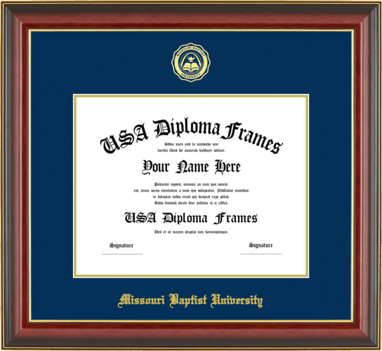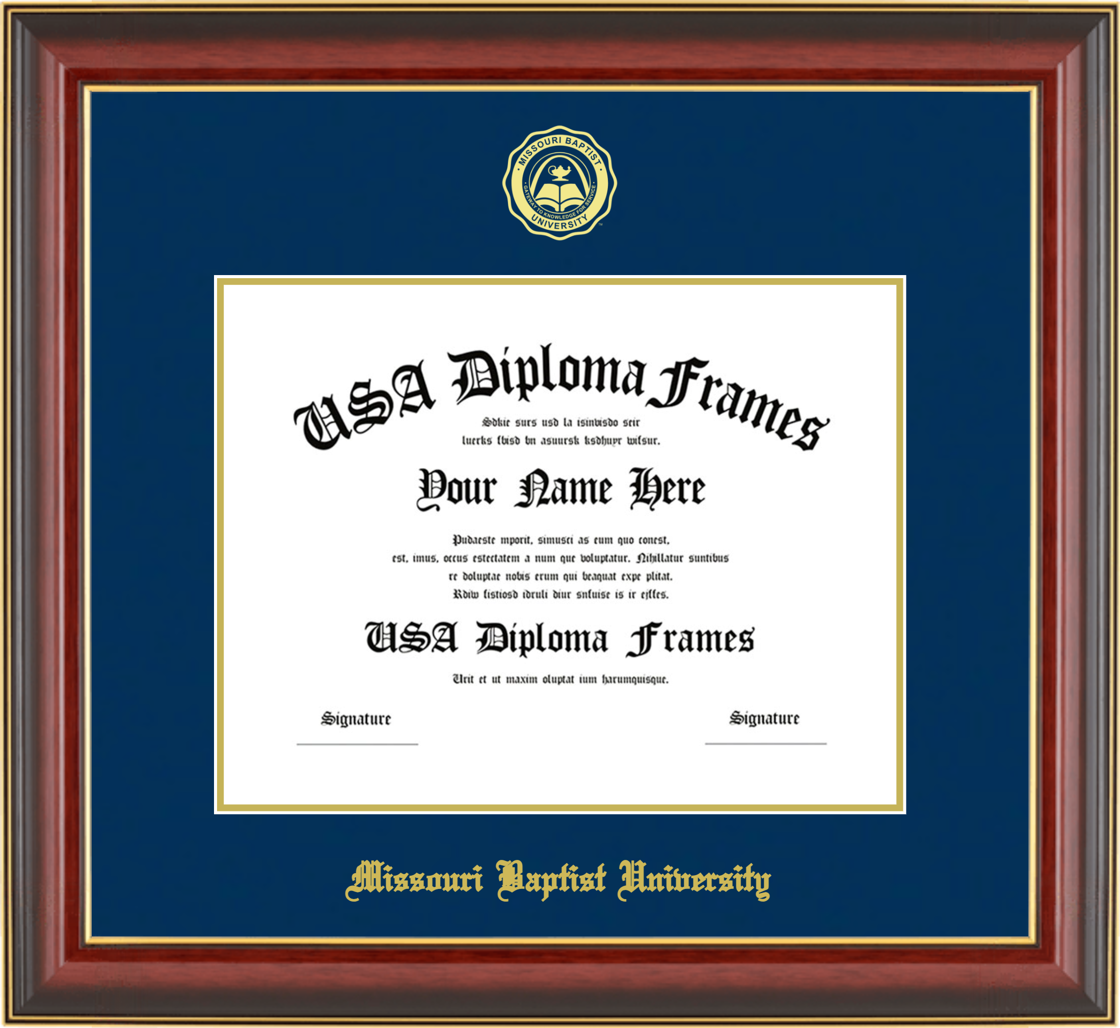Missouri Baptist University Diploma Frame – Cherry Mahogany Gold Trim Glossy – Navy and Gold Mat