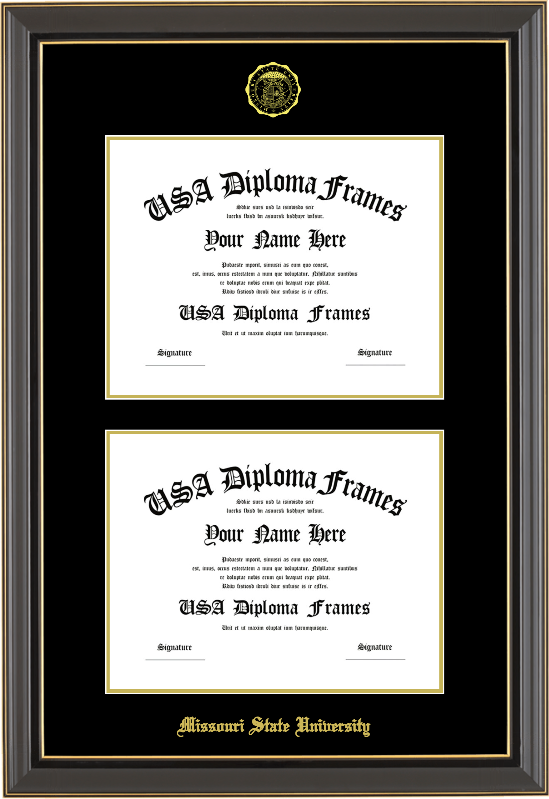 Missouri State University Double Diploma Frame – Double Document – Black Gold Trim Glossy – Black and Gold Mat