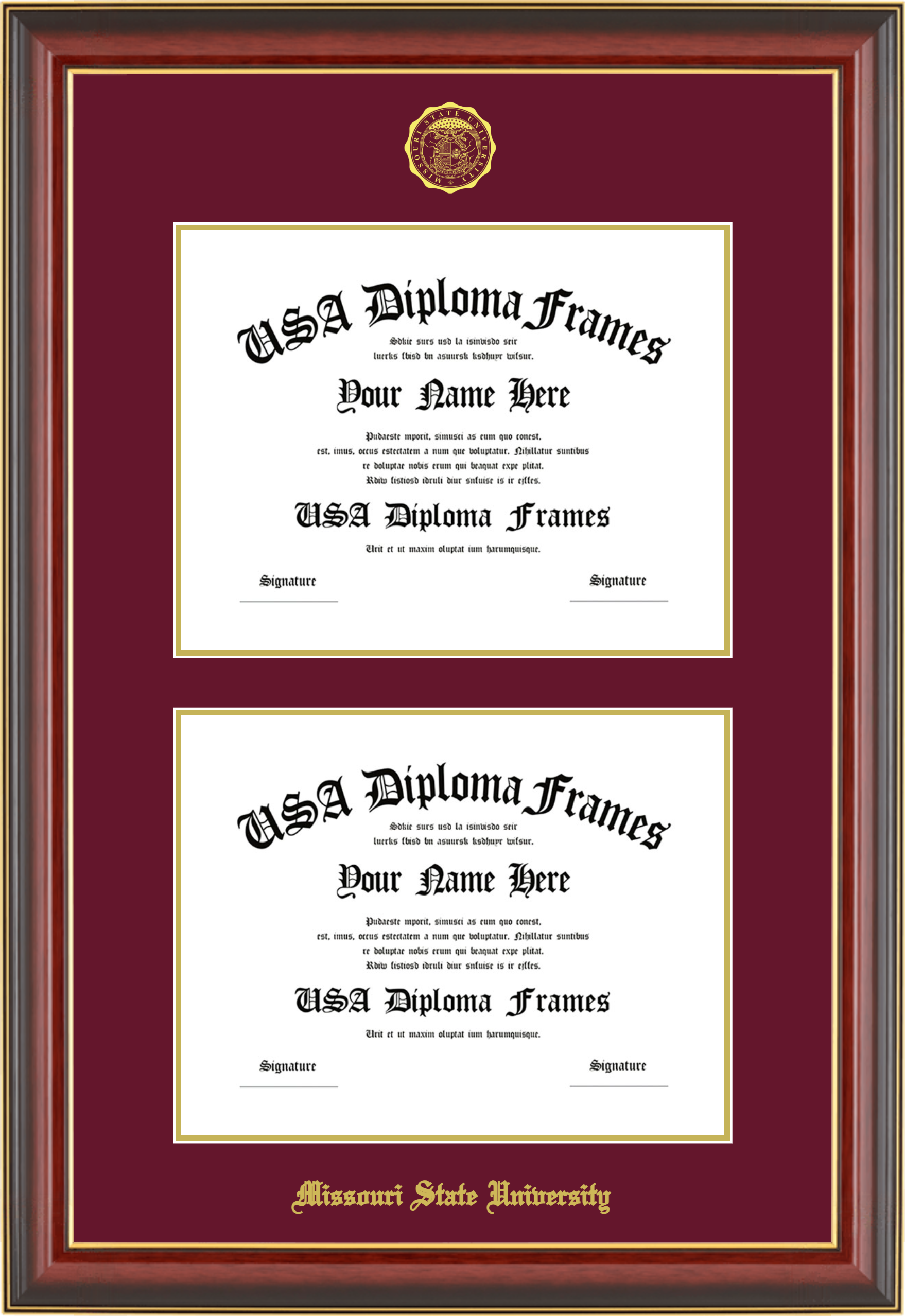 Missouri State University Double Diploma Frame – Double Document – Cherry Mahogany Gold Trim Glossy – Maroon and Gold Mat