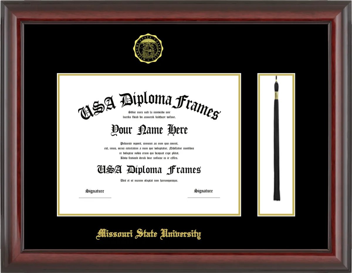 Missouri State University – Single Horizontal Document ( Diploma ) – Cherry Mahogany Glossy – Black Mat – Gold Accent Mat – With Tassel(Default) – With Seal(University Seal Gold) – With Gold Embossing (Missouri State University)