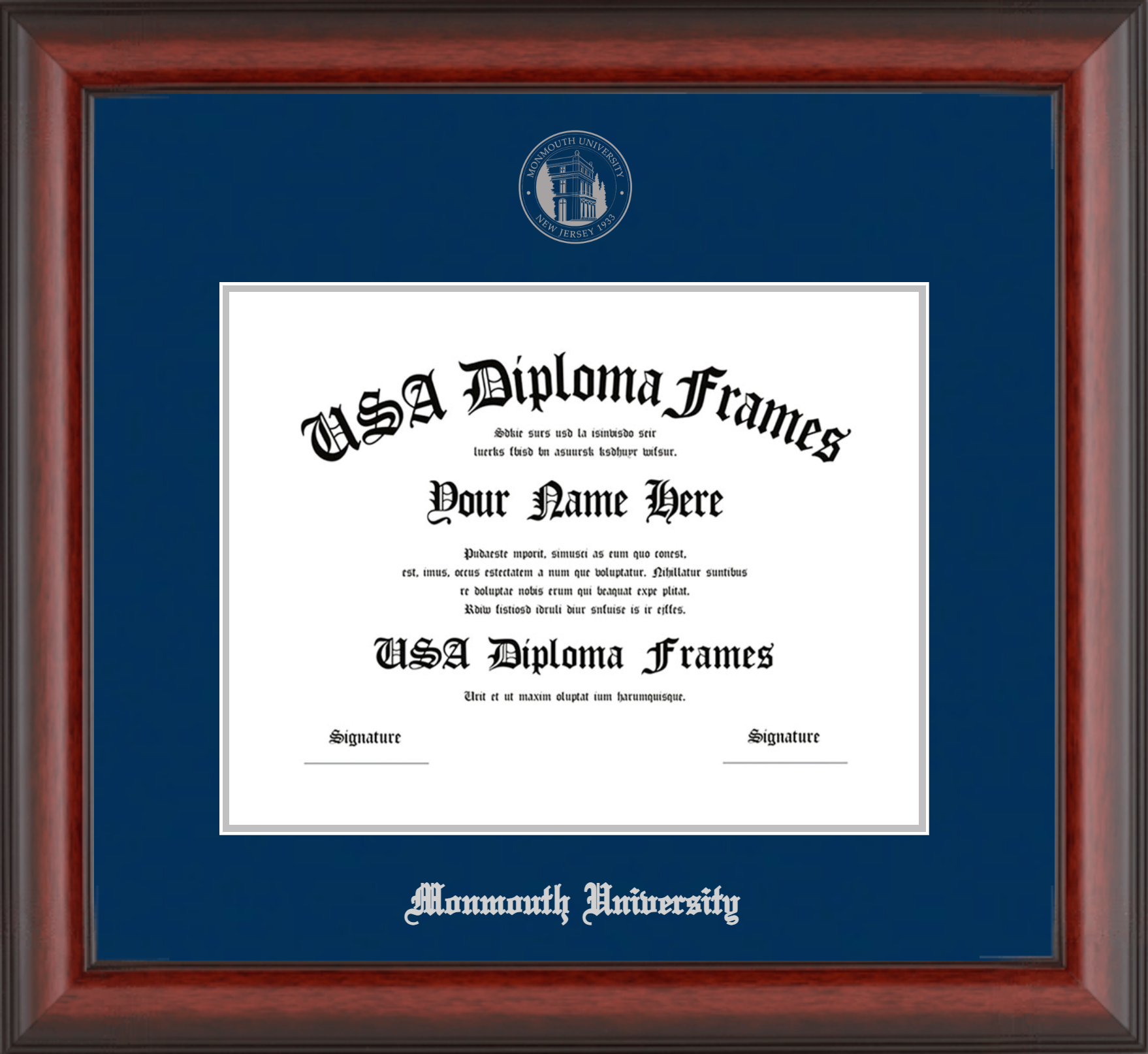 Monmouth University Diploma Frame – Cherry Mahogany Matte – Navy and Silver Mat