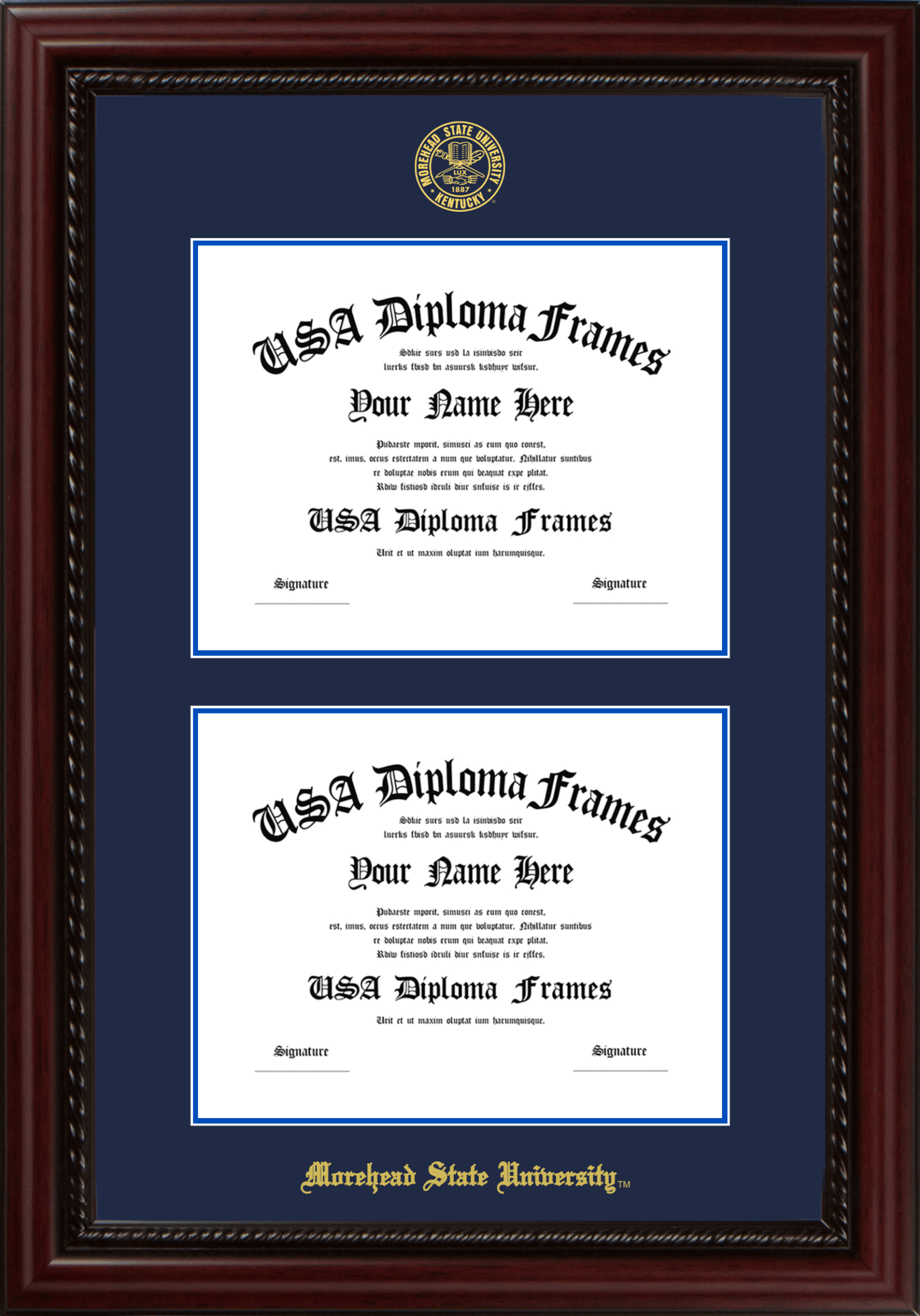 Morehead State University Double Diploma Frame – Double Document – Executive Cherry Rope – Navy and Royal Blue Mat