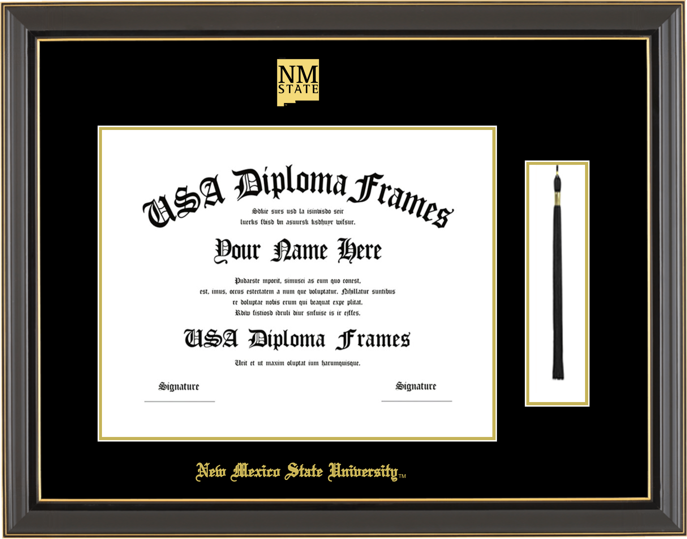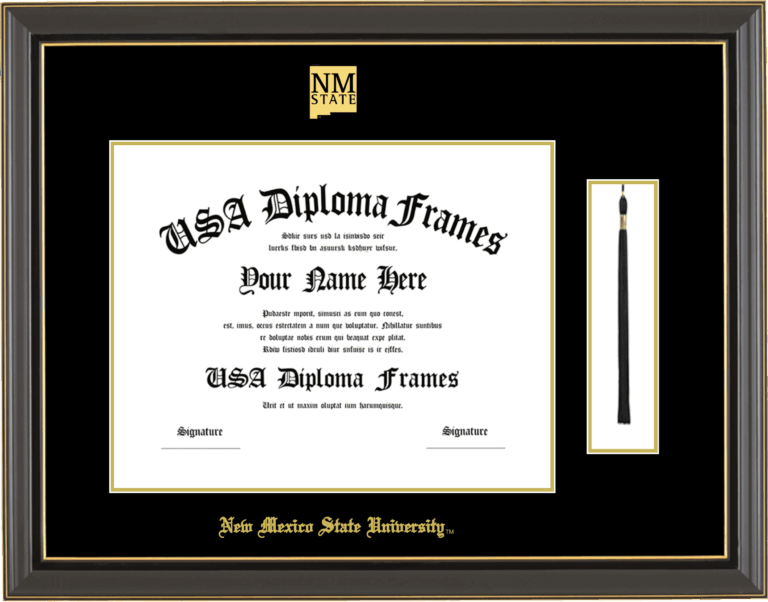 New Mexico State University – Single Horizontal Document ( Diploma ) – Black Gold Trim Glossy – Black Mat – Gold Accent Mat – With Tassel(Default) – With Seal(University Seal Gold) – With Gold Embossing (New Mexico State University)