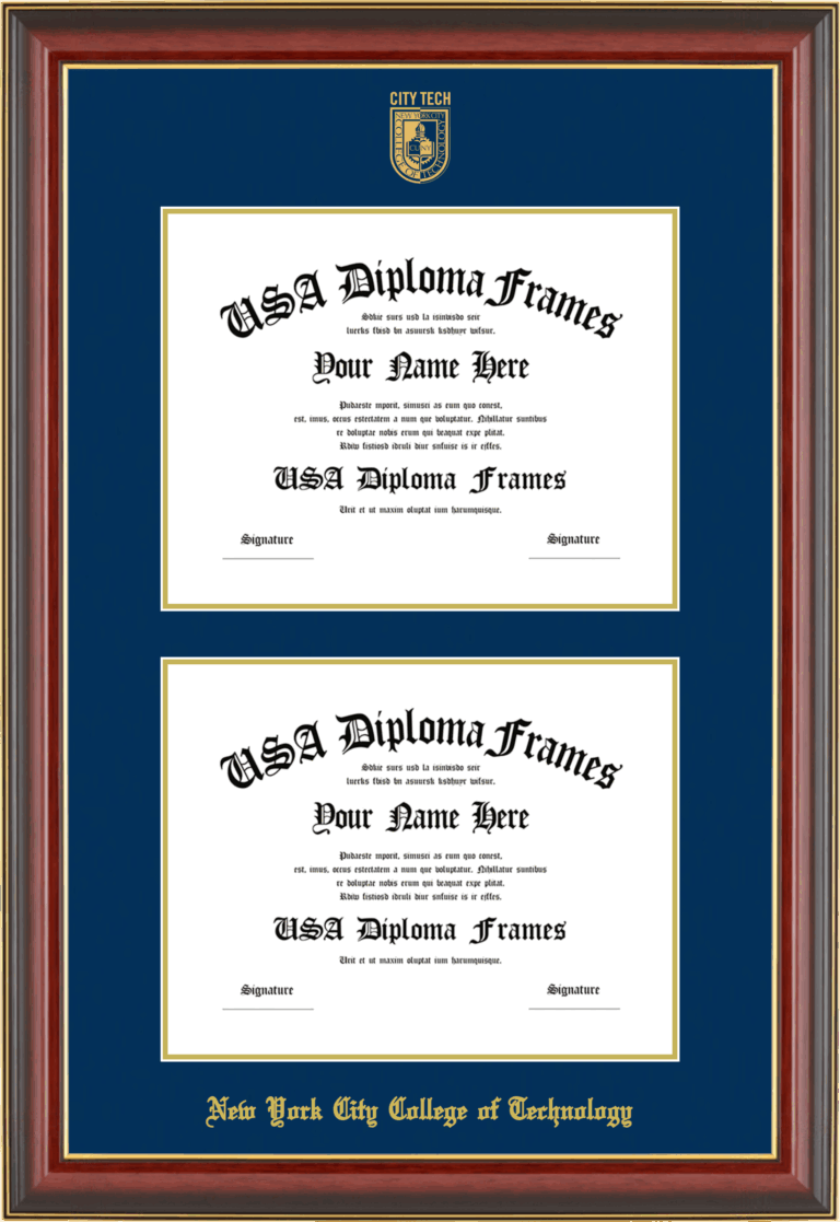 New York City College of Technology Double Diploma Frame – Double Document – Cherry Mahogany Gold Trim Glossy – Navy and Gold Mat