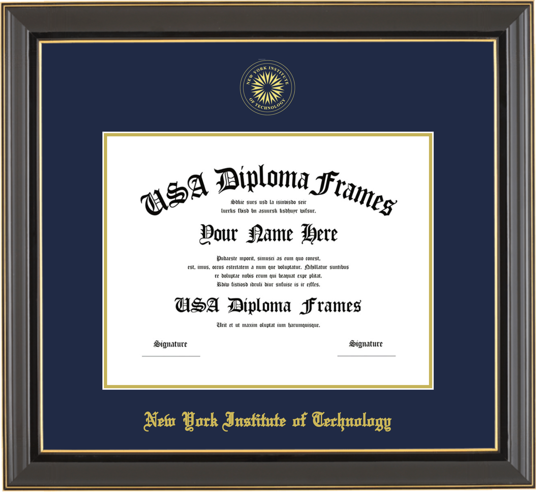 New York Institute of Technology – Single Horizontal Document ( 8 1/2″x11″ ) – Black Gold Trim Glossy – Navy Mat – Gold Accent Mat – With Seal(University Seal Gold) – With Gold Embossing (New York Institute of Technology)
