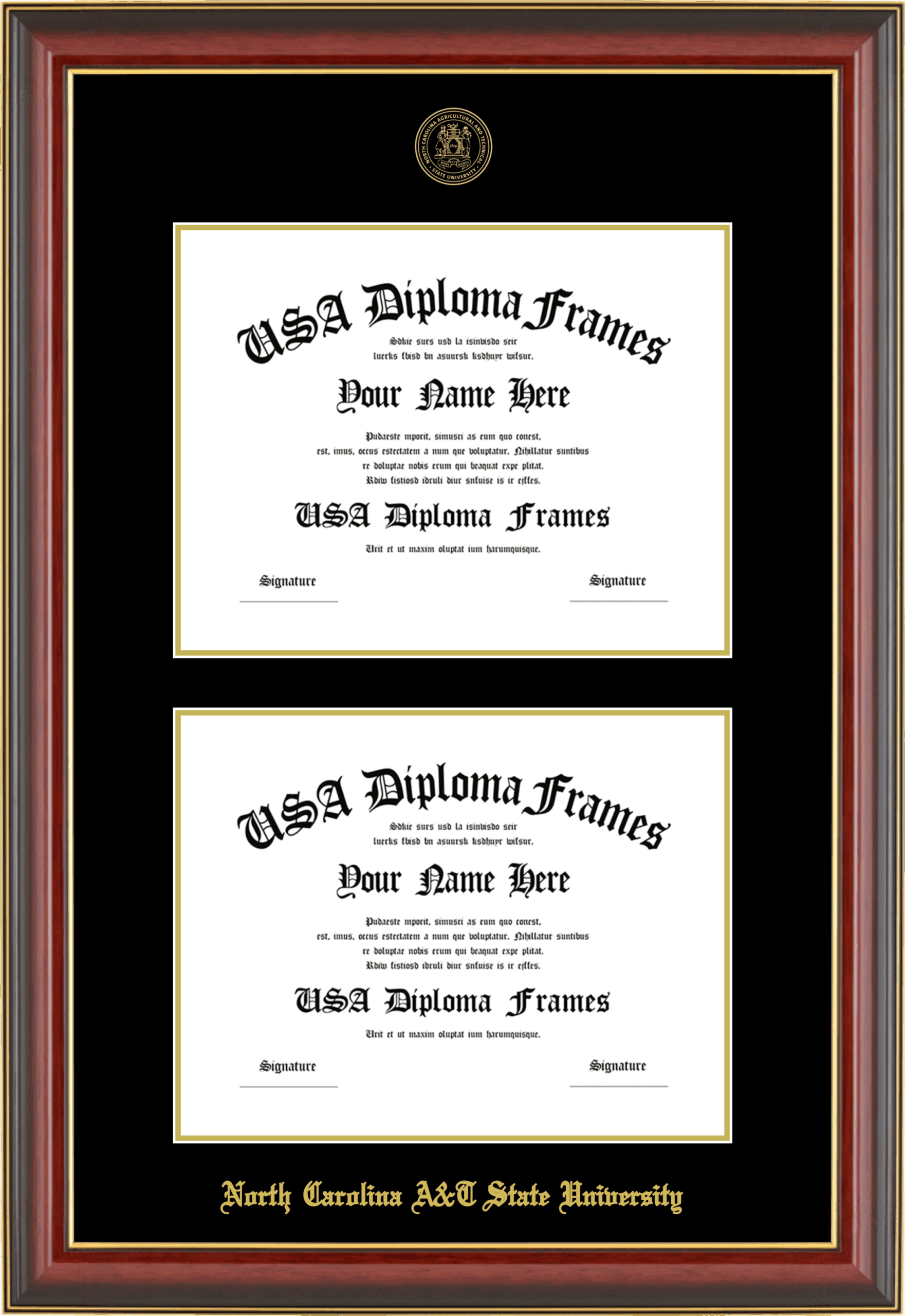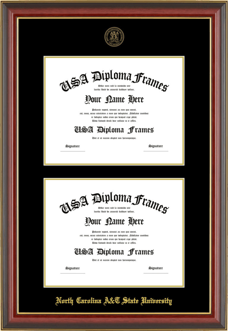 North Carolina A&T State University Double Diploma Frame – Double Document – Cherry Mahogany Gold Trim Glossy – Black and Gold Mat