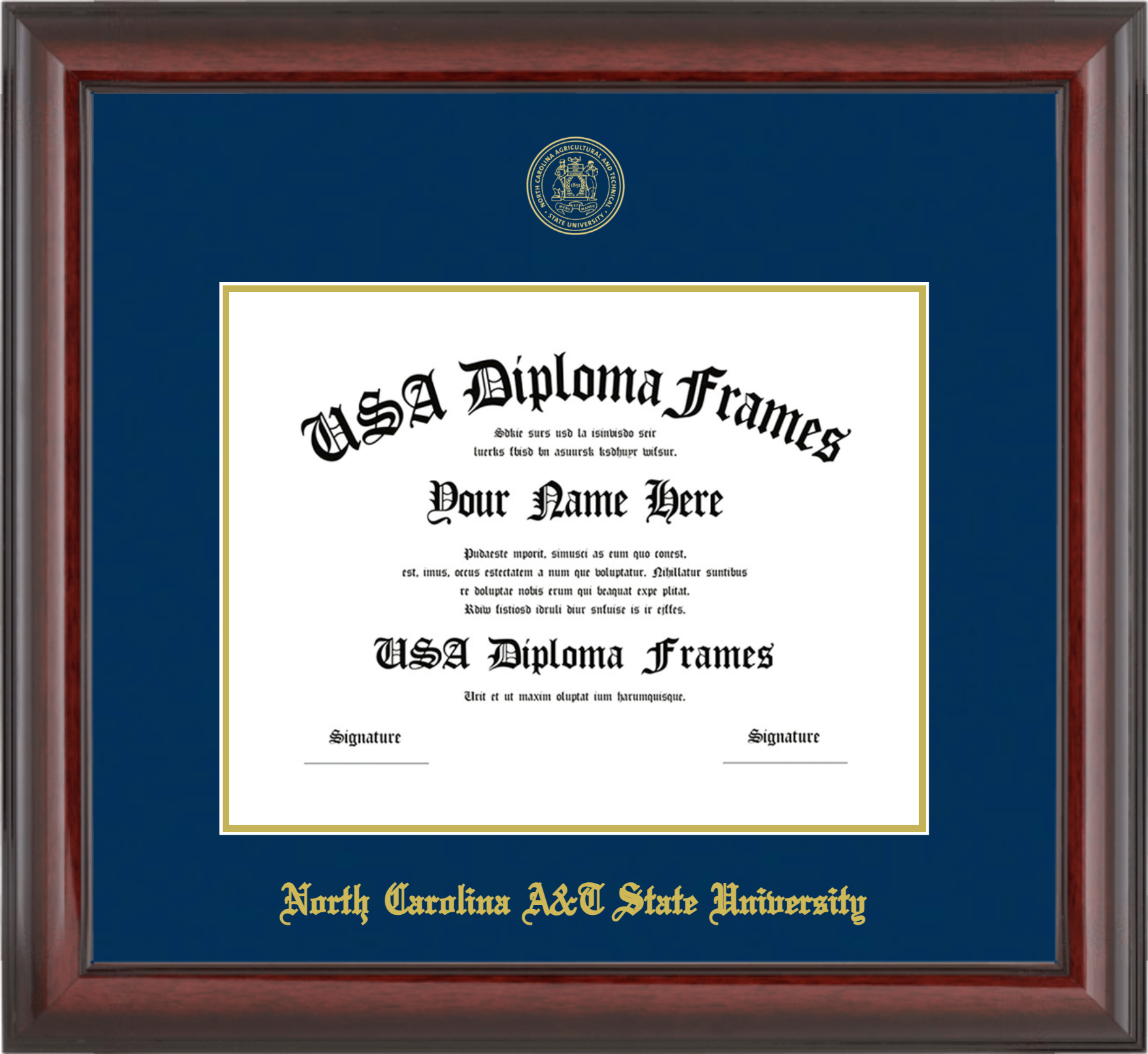 North Carolina Agricultural and Technical State University – Single Horizontal Document ( 8 1/2″x11″ ) – Cherry Mahogany Glossy – Navy Mat – Gold Accent Mat – With Seal(University Seal Gold) – With Gold Embossing (North Carolina A&T State University)
