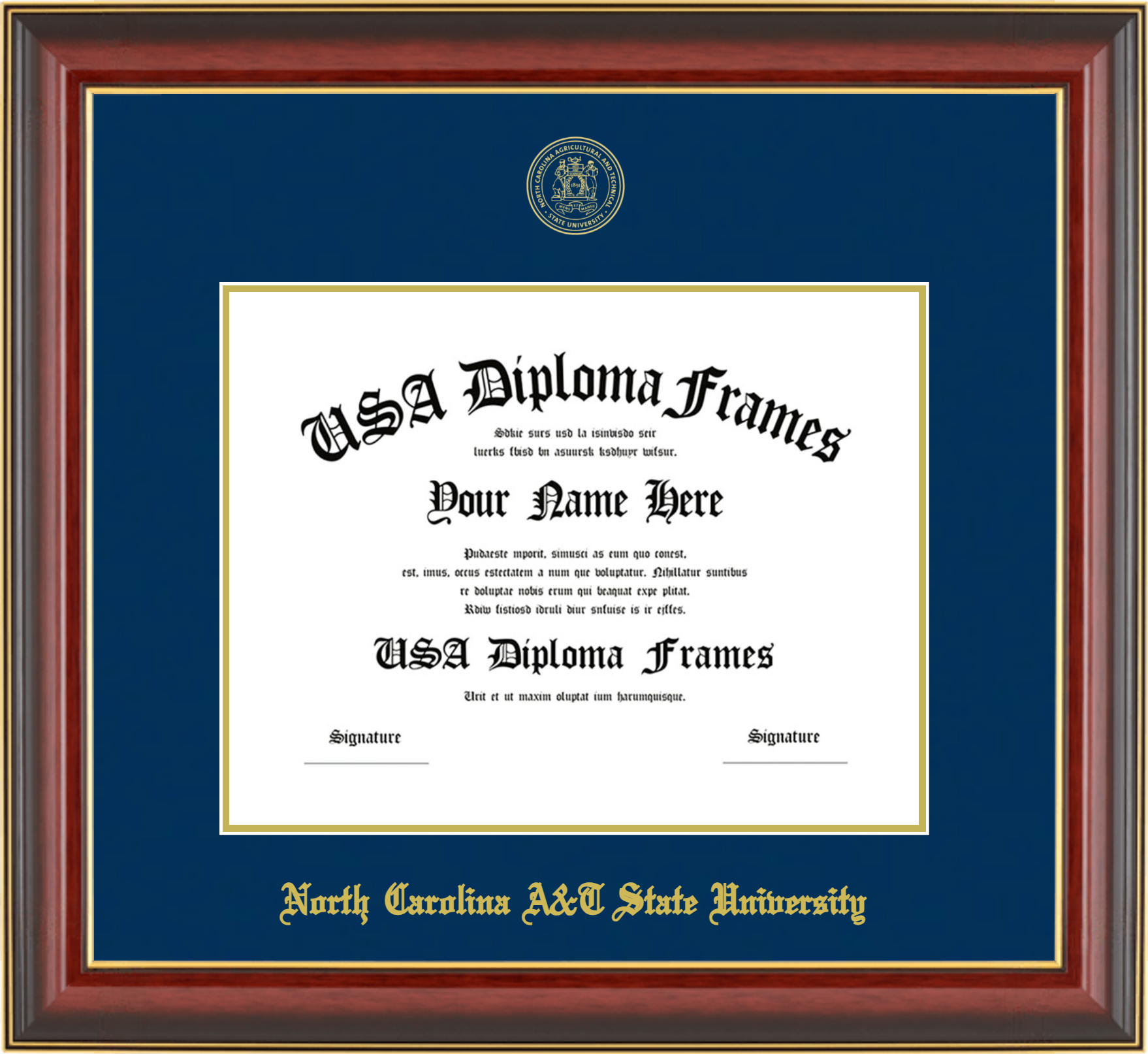 North Carolina Agricultural and Technical State University – Single Horizontal Document ( 8 1/2″x11″ ) – Cherry Mahogany Gold Trim Glossy – Navy Mat – Gold Accent Mat – With Seal(University Seal Gold) – With Gold Embossing (North Carolina A&T State University)
