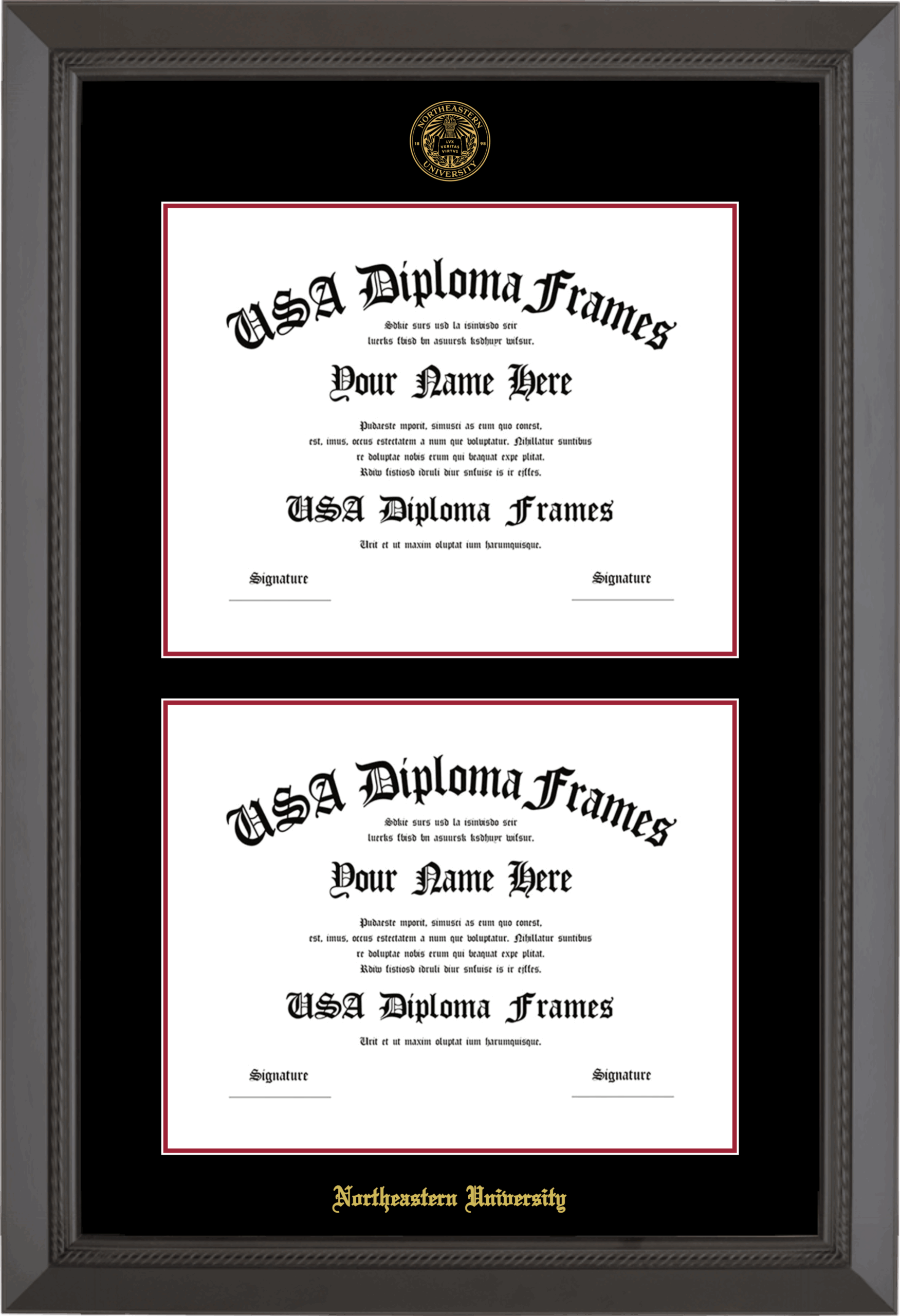 Northeastern University Double Diploma Frame – Double Document – Black Rope – Black and Crimson Mat