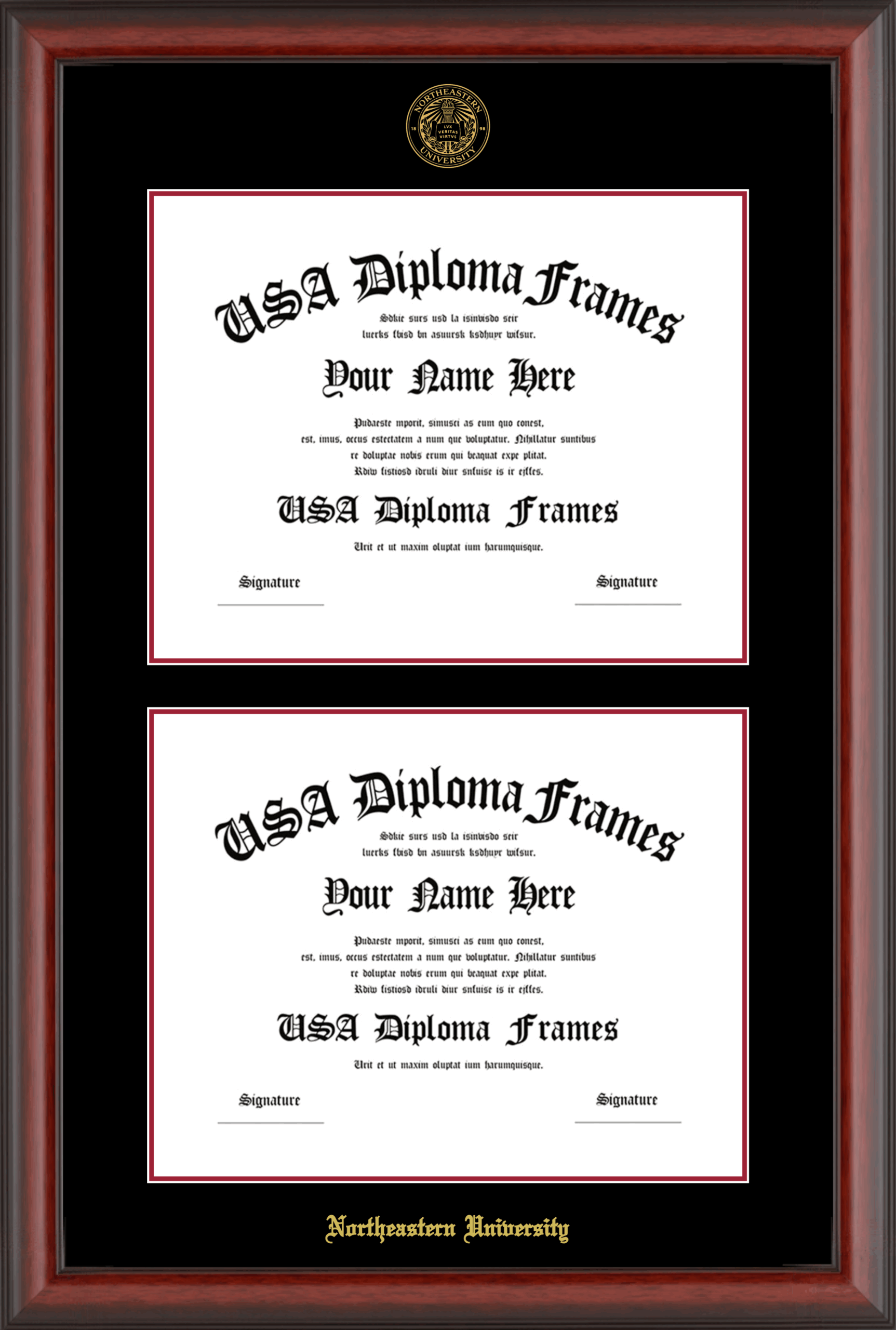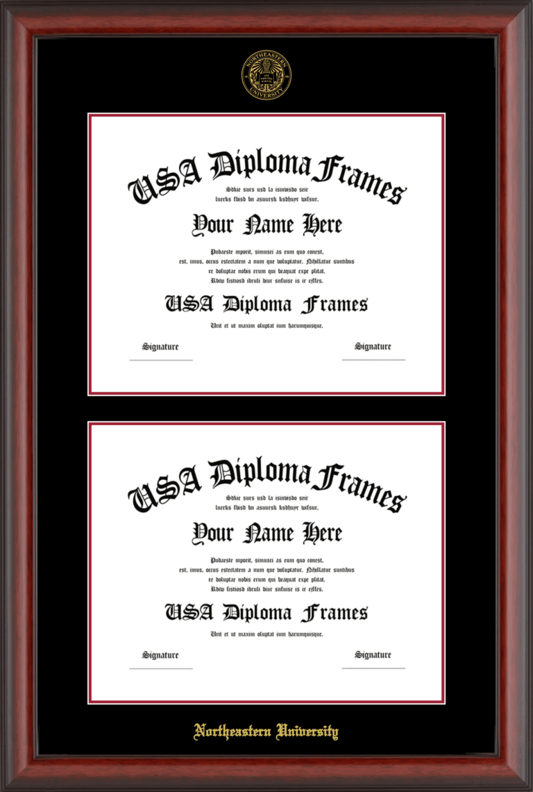 Northeastern University Double Diploma Frame – Double Document – Cherry Mahogany Matte – Black and Crimson Mat