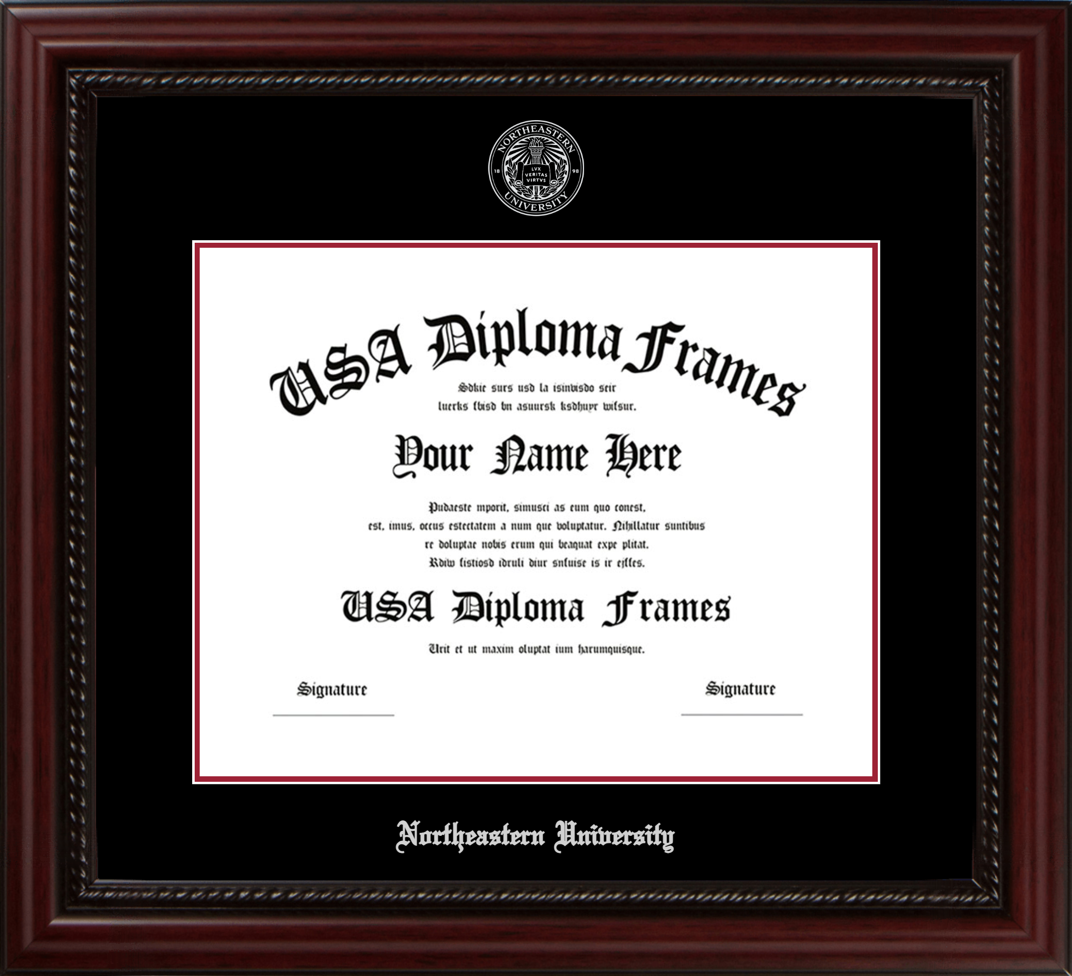 Northeastern University Diploma Frame – Executive Cherry Rope – Black and Crimson Mat