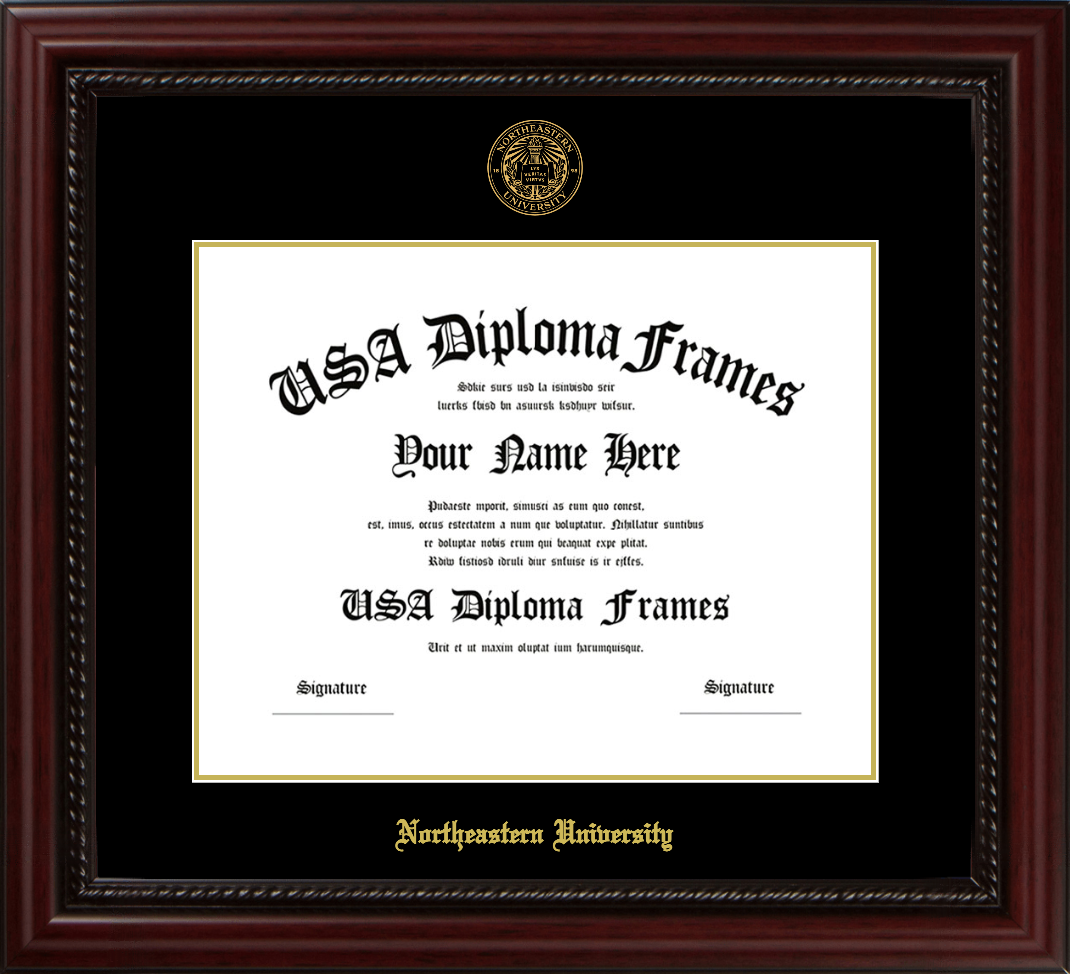 Northeastern University Diploma Frame – Executive Cherry Rope – Black and Gold Mat