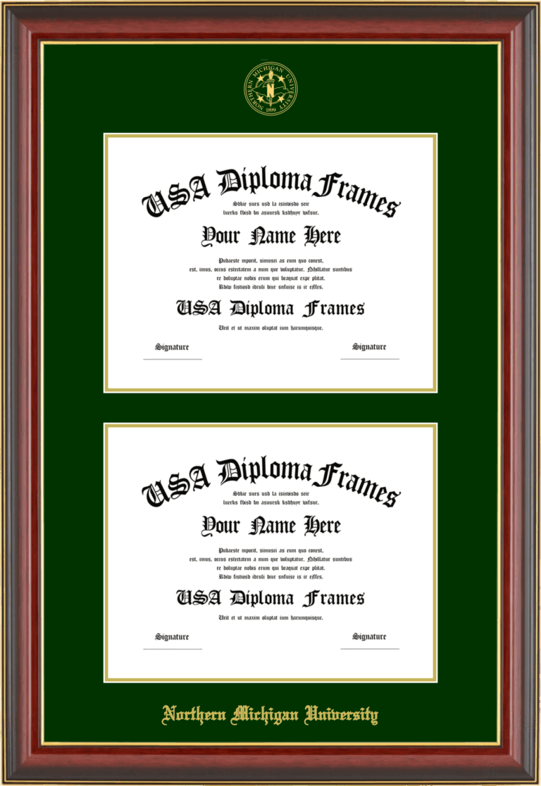 Northern Michigan University Double Diploma Frame – Double Document – Cherry Mahogany Gold Trim Glossy – Winter Green and Gold Mat