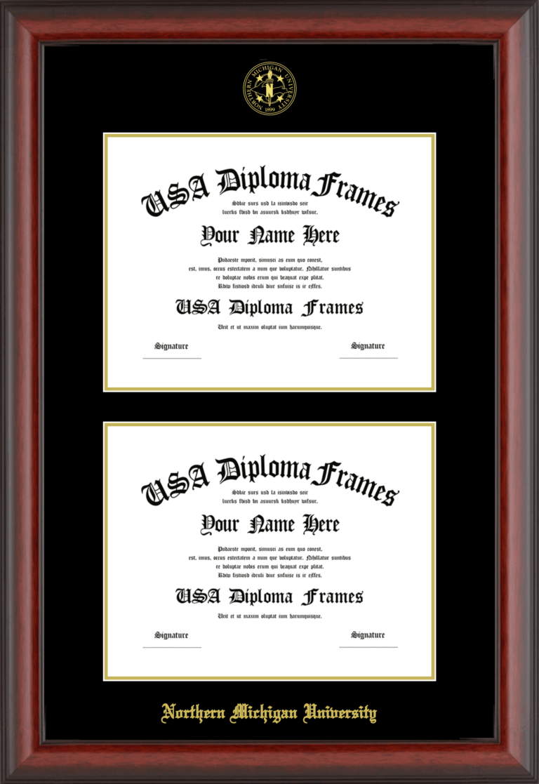 Northern Michigan University Double Diploma Frame – Double Document – Cherry Mahogany Matte – Black and Gold Mat