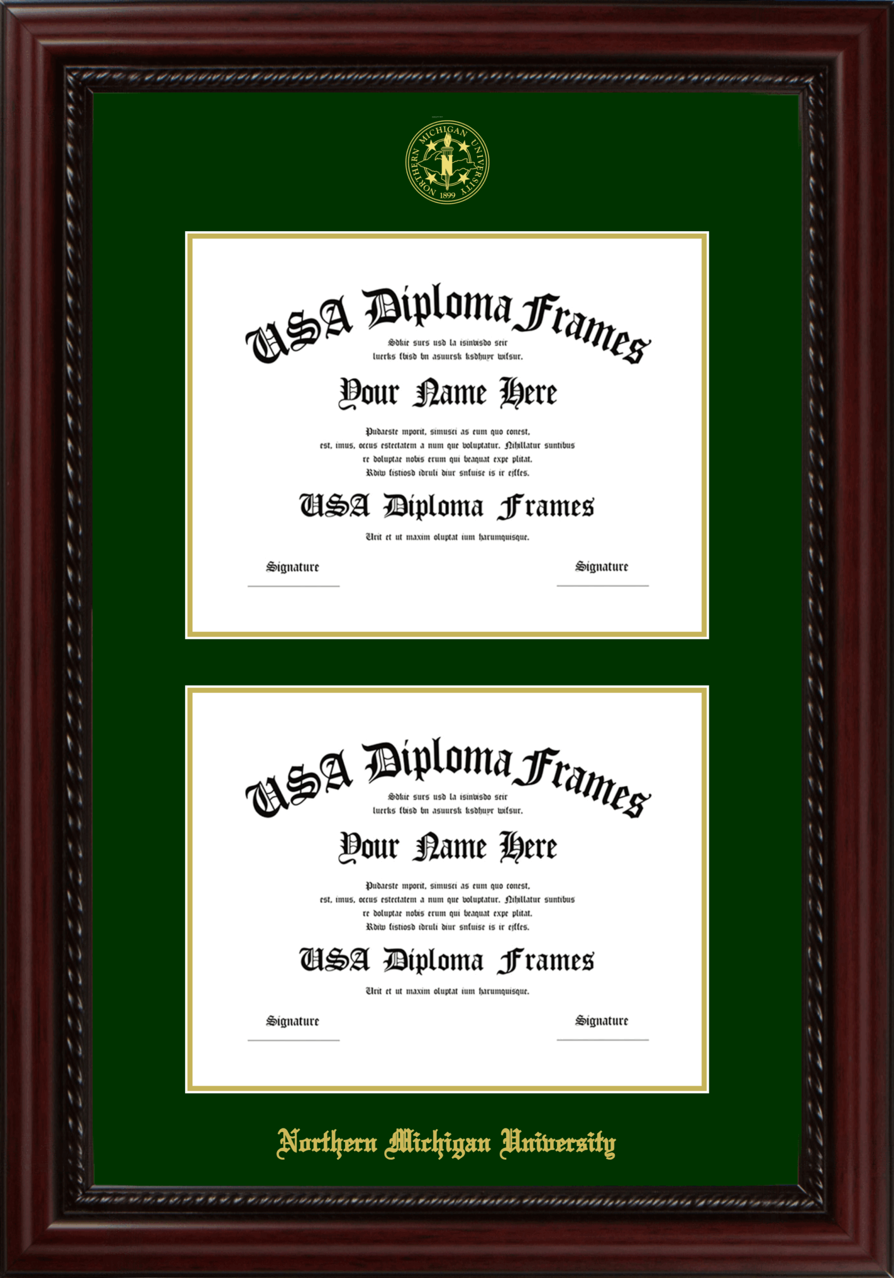 Northern Michigan University Double Diploma Frame – Double Document – Executive Cherry Rope – Winter Green and Gold Mat