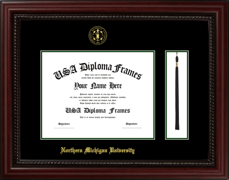 Northern Michigan University Diploma Frame with Tassel – Executive Cherry Rope – Black and Winter Green Mat