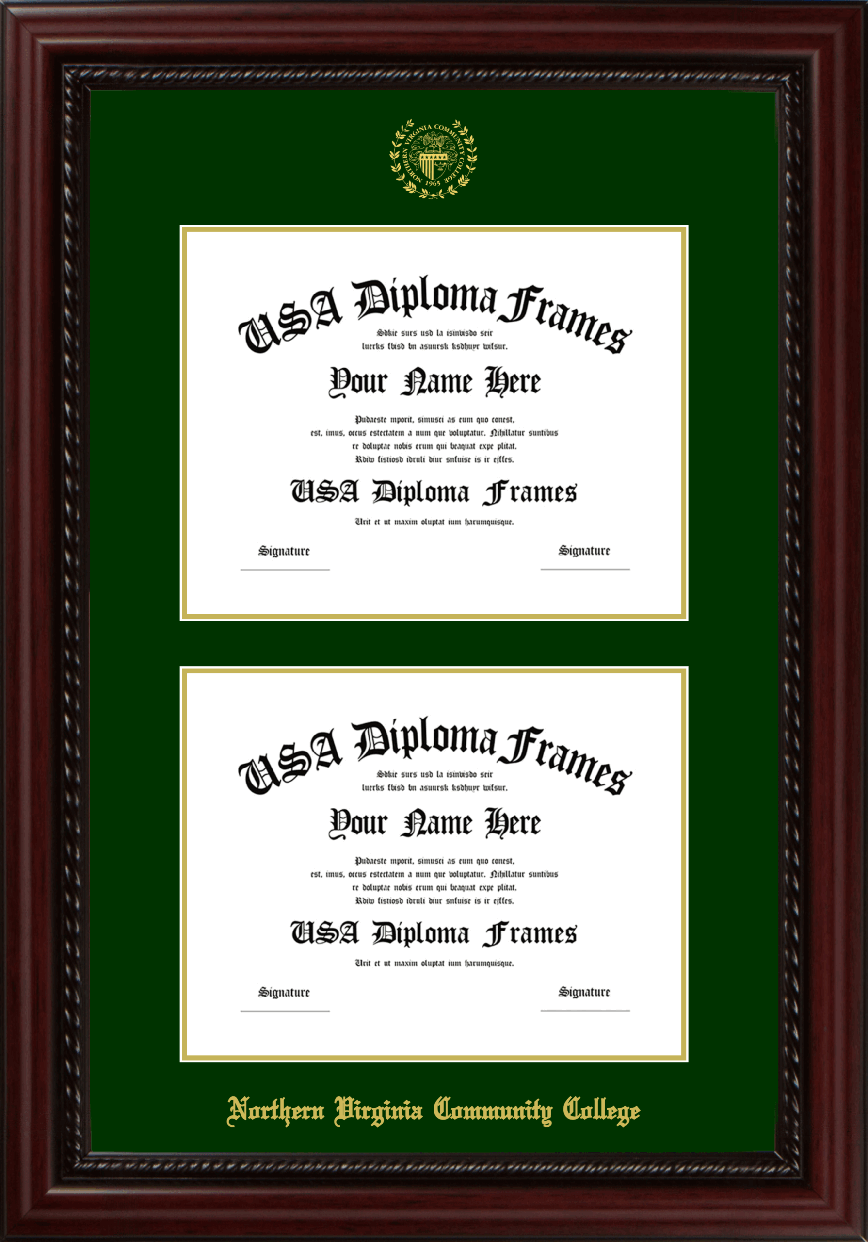 Northern Virginia Community College Double Diploma Frame – Double Document – Executive Cherry Rope – Winter Green and Gold Mat