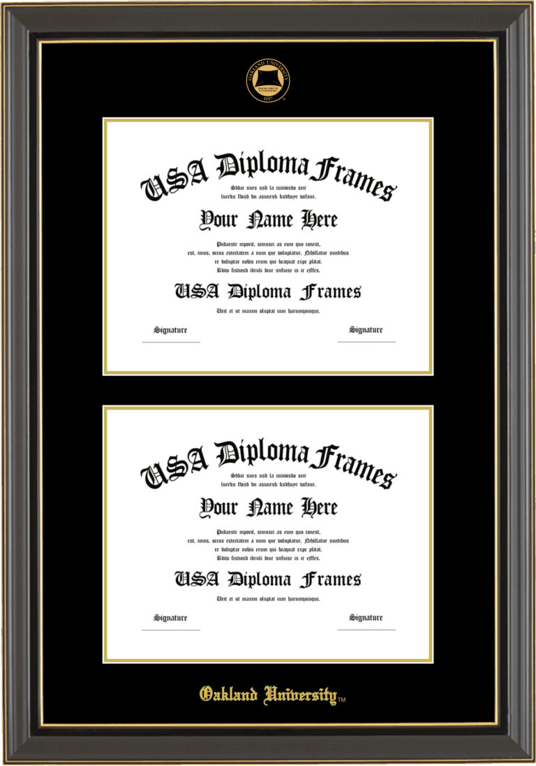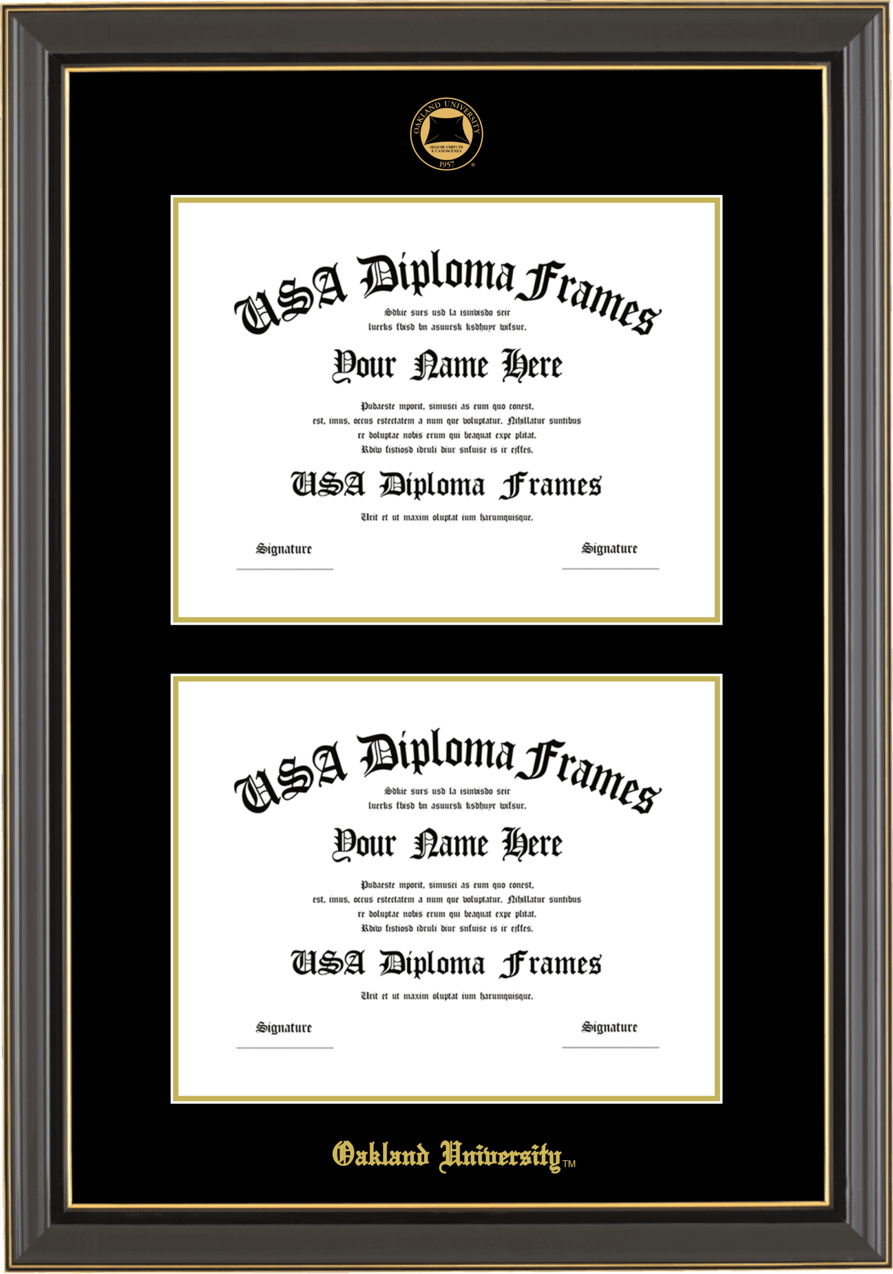 Oakland University Double Diploma Frame – Double Document – Black Gold Trim Glossy – Black and Gold Mat