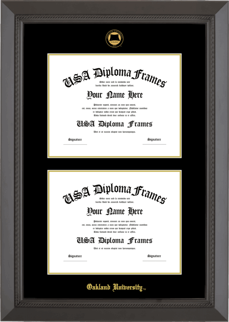 Oakland University Double Diploma Frame – Double Document – Black Rope – Black and Gold Mat