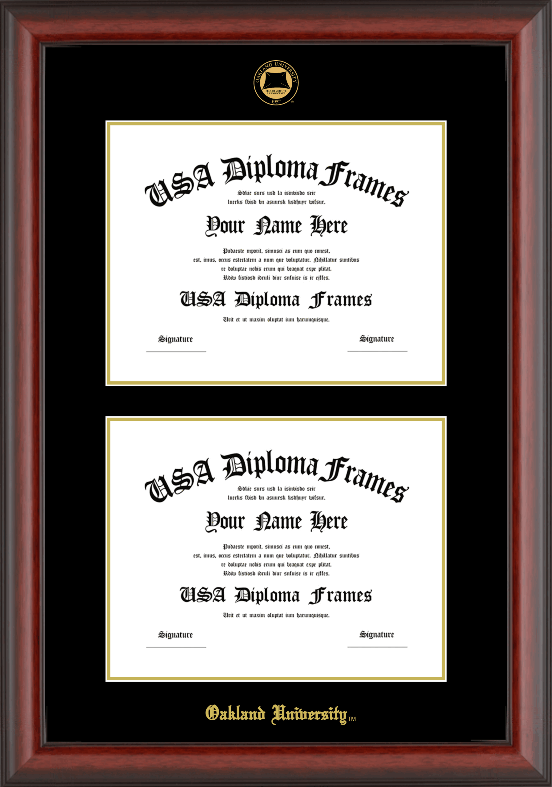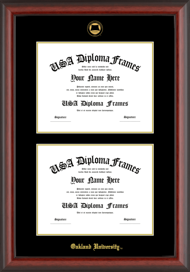 Oakland University Double Diploma Frame – Double Document – Cherry Mahogany Matte – Black and Gold Mat