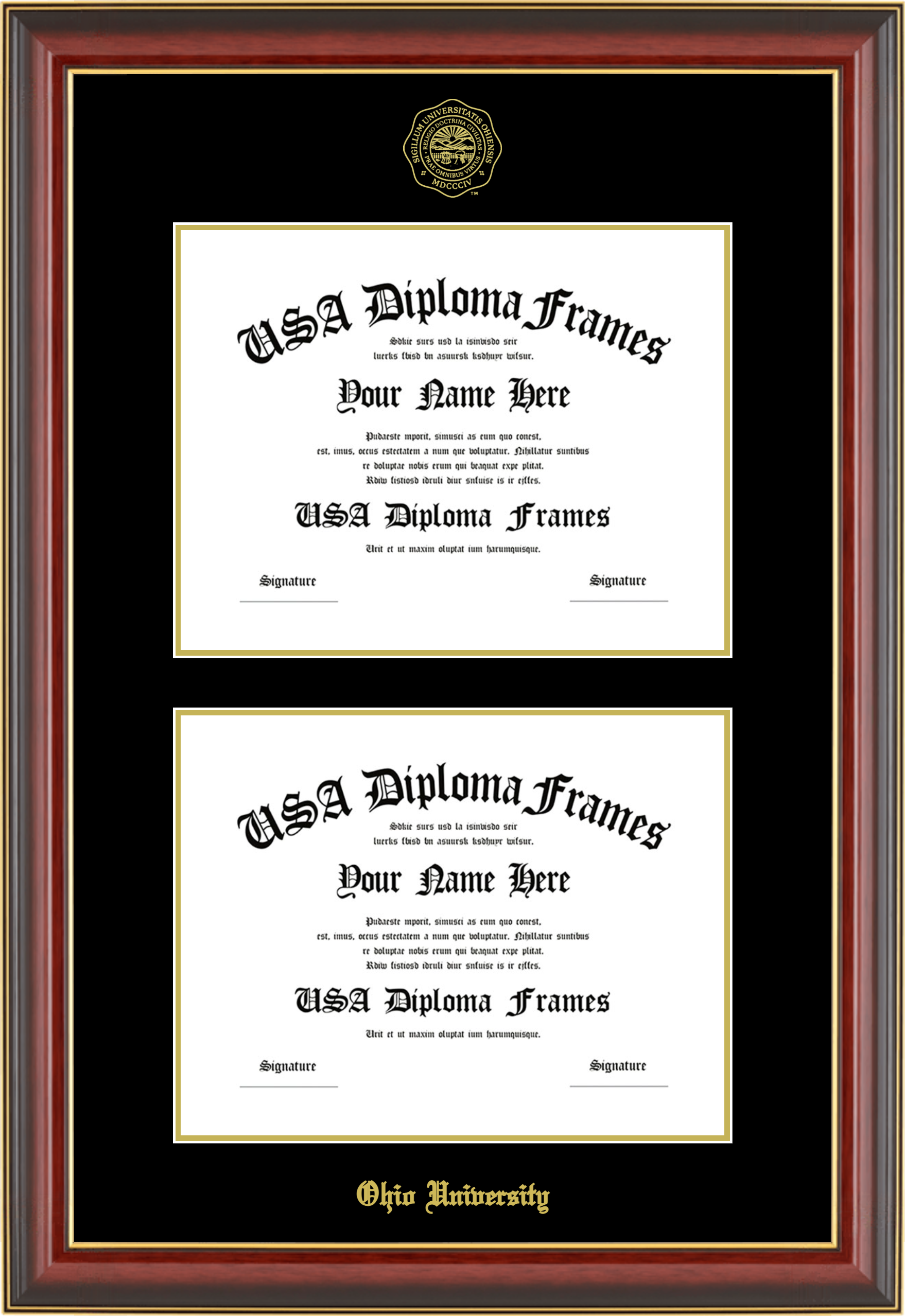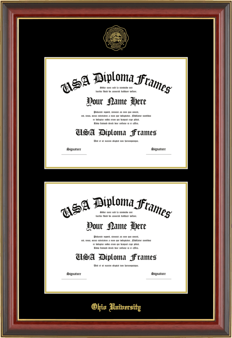 Ohio University – Double Document Vertically ( 8 1/2″x11″ , 8 1/2″x11″ ) – Cherry Mahogany Gold Trim Glossy – Black Mat – Gold Accent Mat – With Seal(University Seal Gold) – With Gold Embossing (Ohio University)