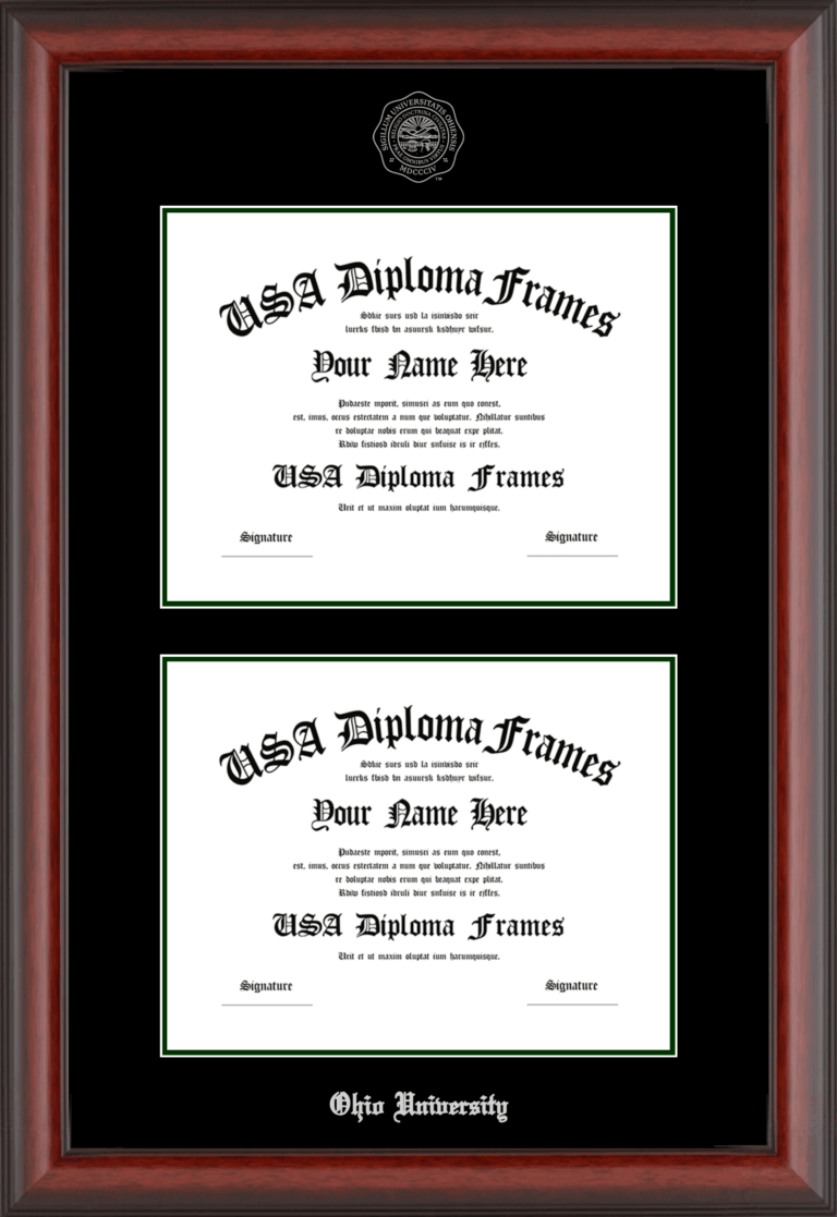 Ohio University – Double Document Vertically ( 8 1/2″x11″ , 8 1/2″x11″ ) – Cherry Mahogany Matte – Black Mat – Winter Green Accent Mat – With Seal(University Seal Silver) – With Silver Embossing (Ohio University)