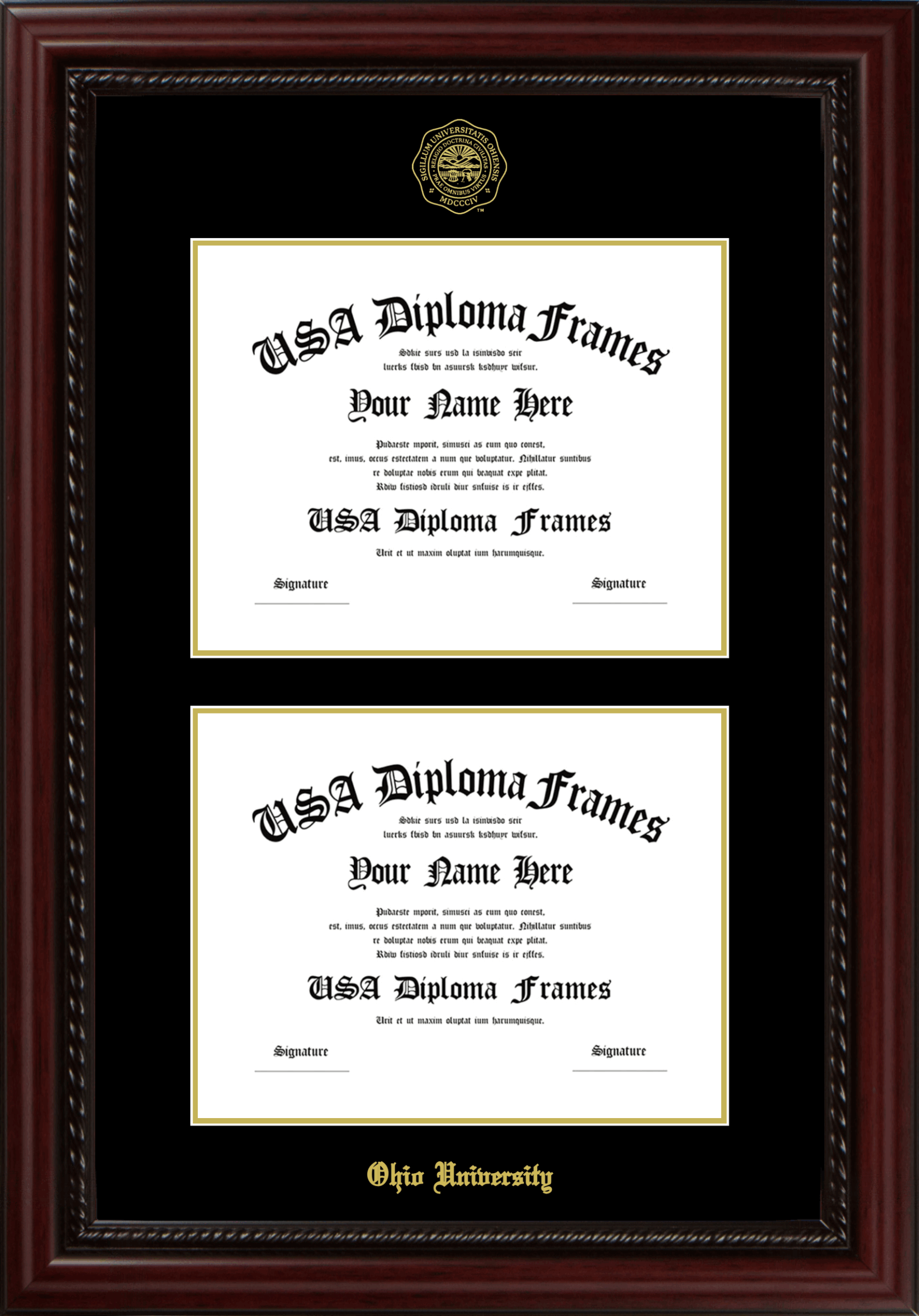 Ohio University – Double Document Vertically ( 8 1/2″x11″ , 8 1/2″x11″ ) – Executive Cherry Rope – Black Mat – Gold Accent Mat – With Seal(University Seal Gold) – With Gold Embossing (Ohio University)