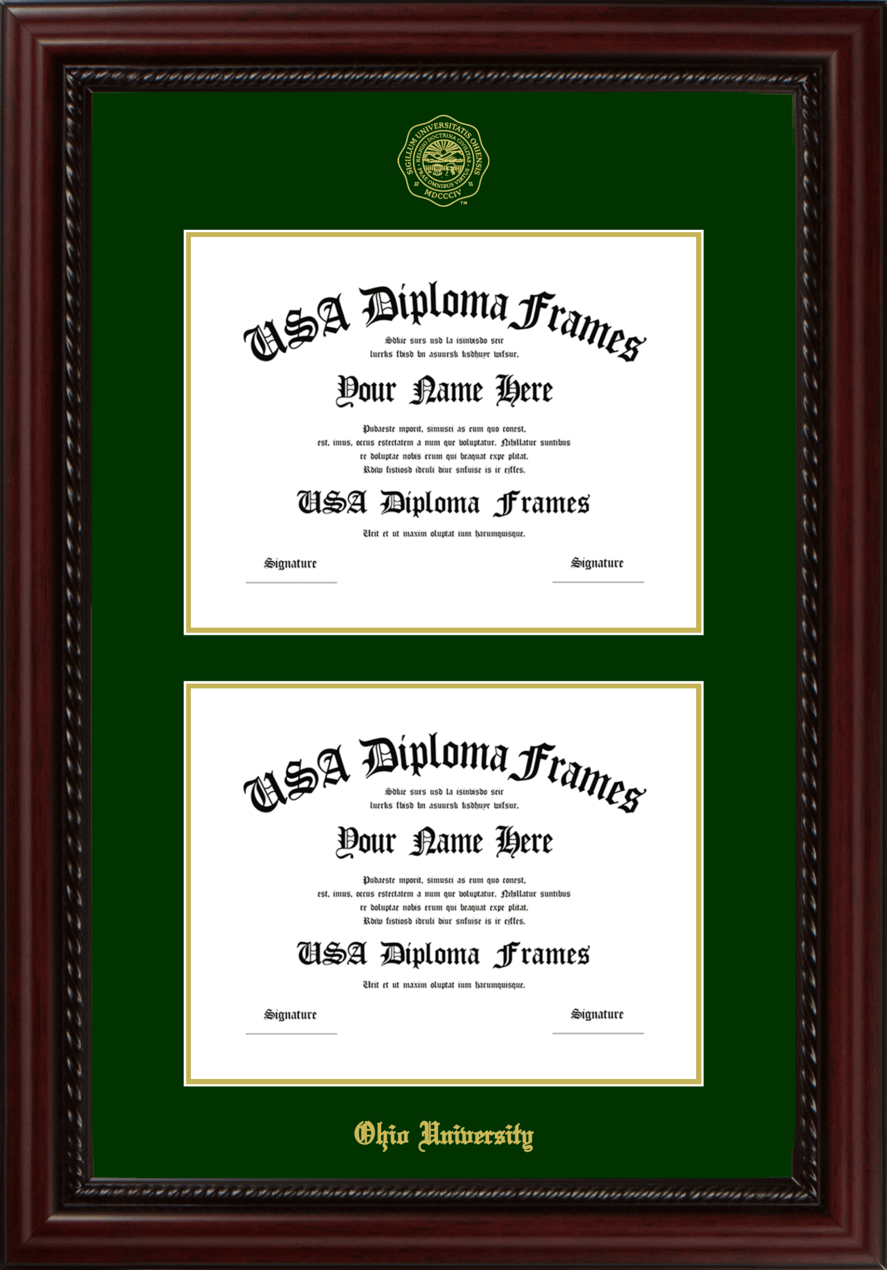 Ohio University – Double Document Vertically ( 8 1/2″x11″ , 8 1/2″x11″ ) – Executive Cherry Rope – Winter Green Mat – Gold Accent Mat – With Seal(University Seal Gold) – With Gold Embossing (Ohio University)