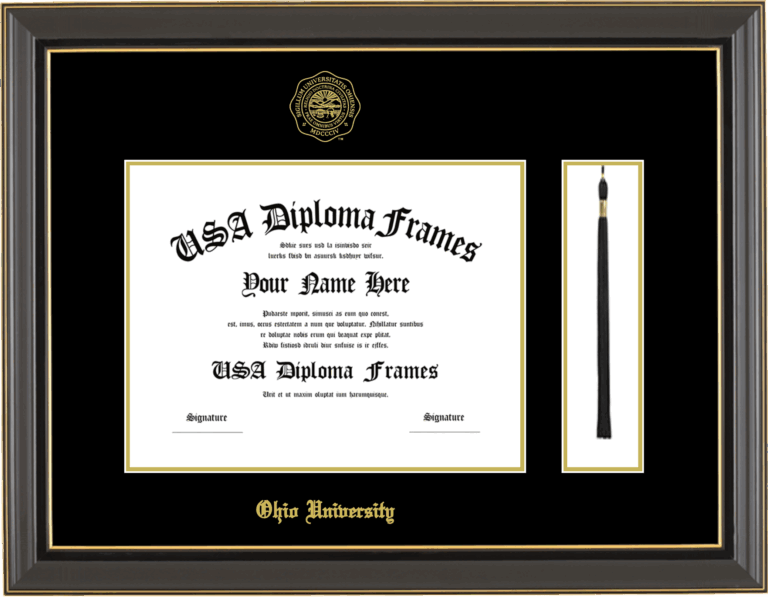 Ohio University – Single Horizontal Document ( 8 1/2″x11″ ) – Black Gold Trim Glossy – Black Mat – Gold Accent Mat – With Tassel(Default) – With Seal(University Seal Gold) – With Gold Embossing (Ohio University)