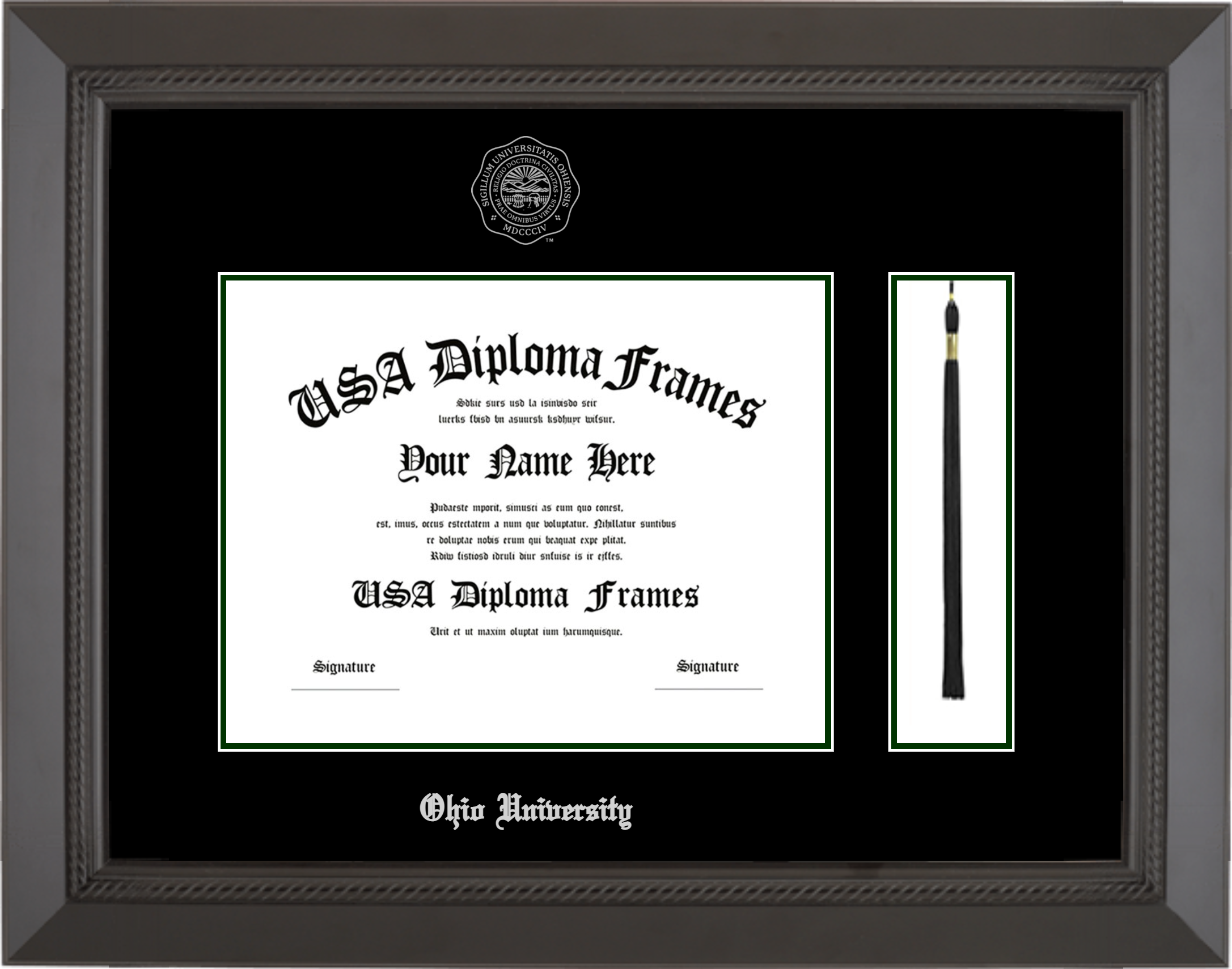 Ohio University – Single Horizontal Document ( 8 1/2″x11″ ) – Black Rope – Black Mat – Winter Green Accent Mat – With Tassel(Default) – With Seal(University Seal Silver) – With Silver Embossing (Ohio University)