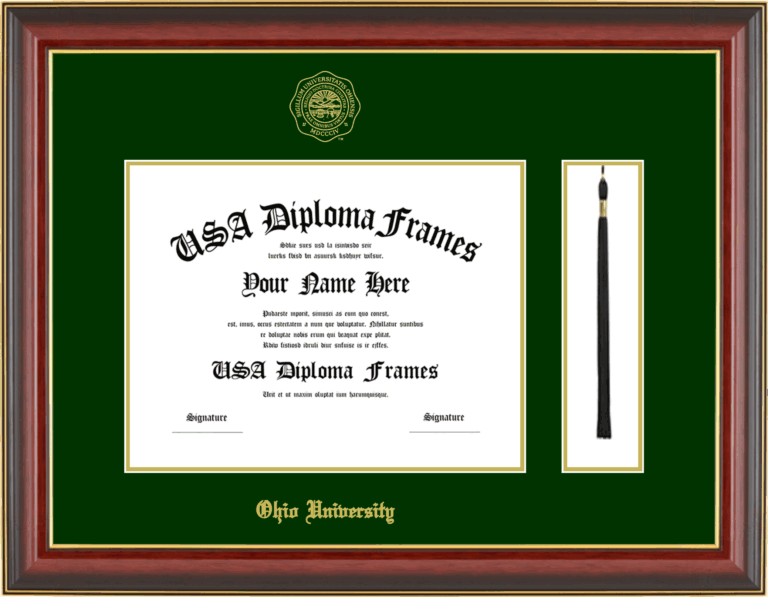 Ohio University – Single Horizontal Document ( 8 1/2″x11″ ) – Cherry Mahogany Gold Trim Glossy – Winter Green Mat – Gold Accent Mat – With Tassel(Default) – With Seal(University Seal Gold) – With Gold Embossing (Ohio University)
