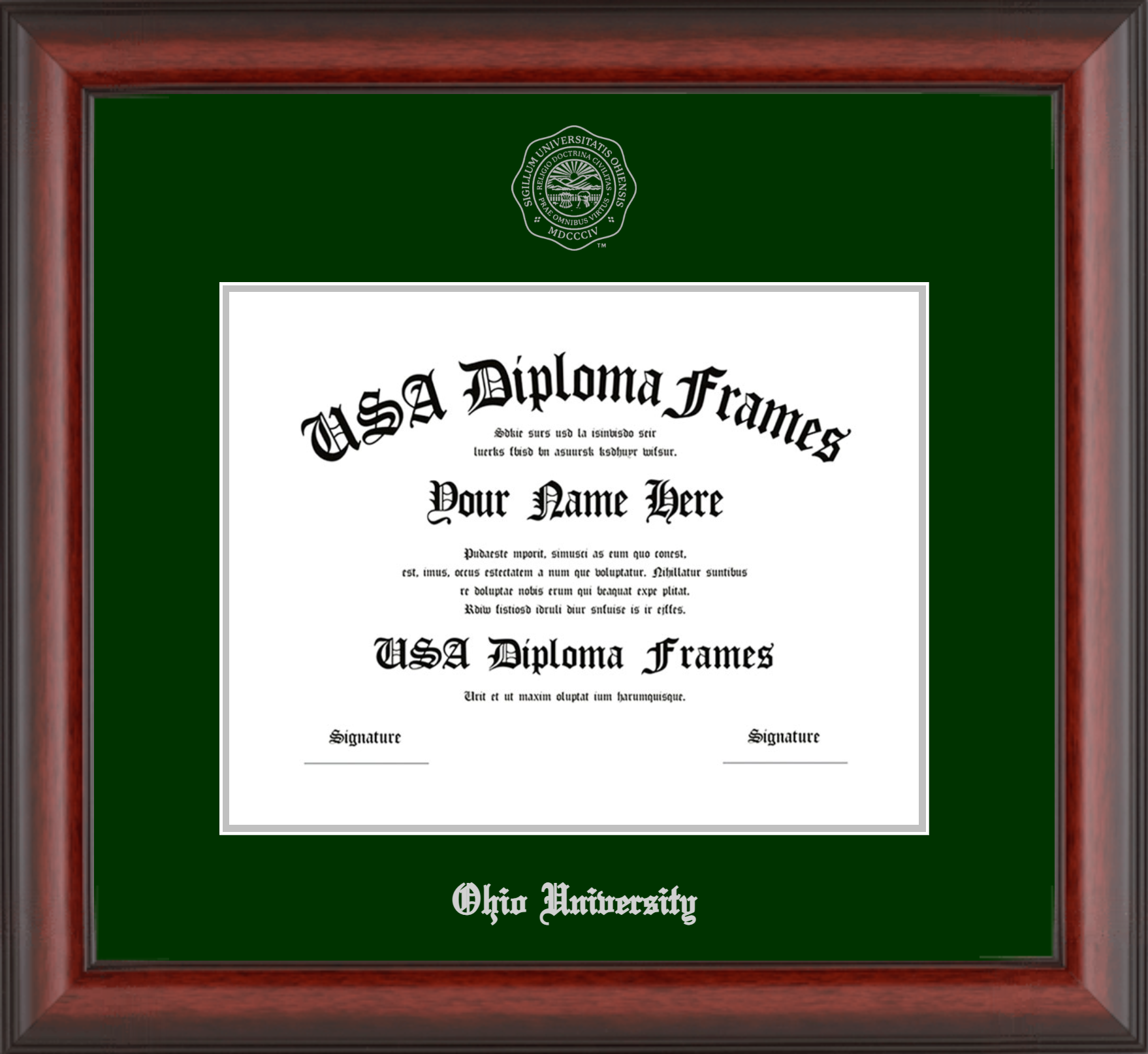 Ohio University – Single Horizontal Document ( 8 1/2″x11″ ) – Cherry Mahogany Matte – Winter Green Mat – Silver Accent Mat – With Seal(University Seal Silver) – With Silver Embossing (Ohio University)