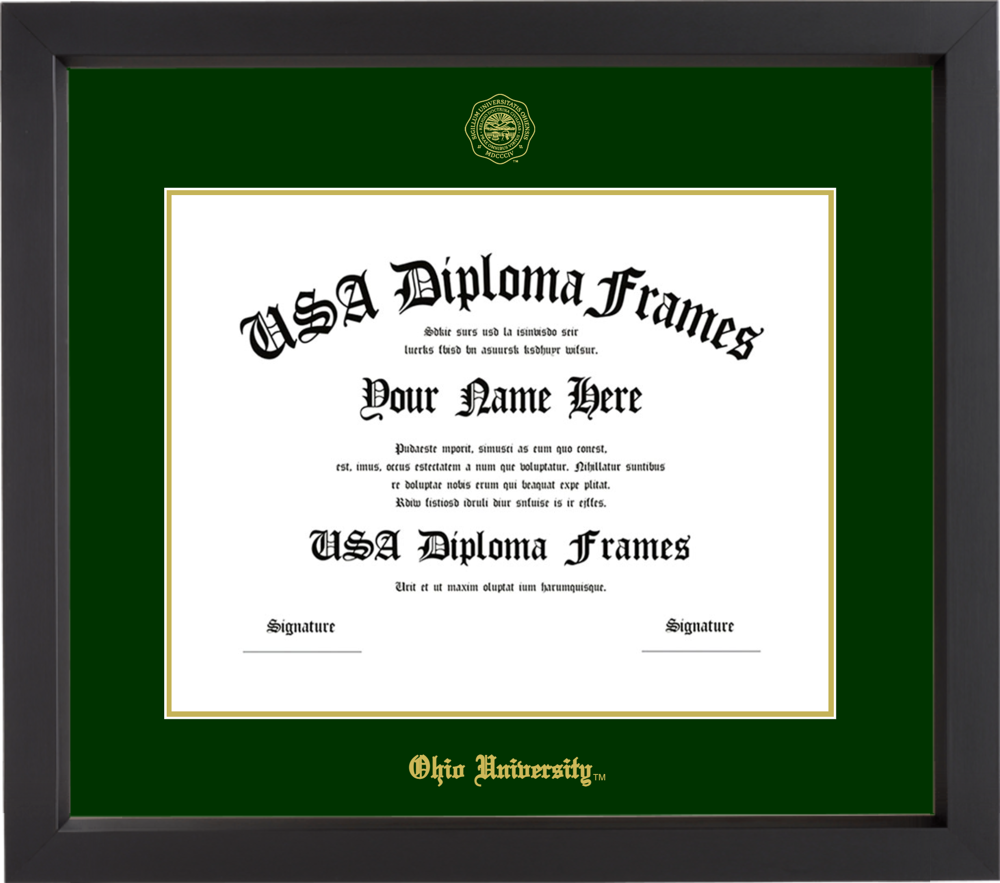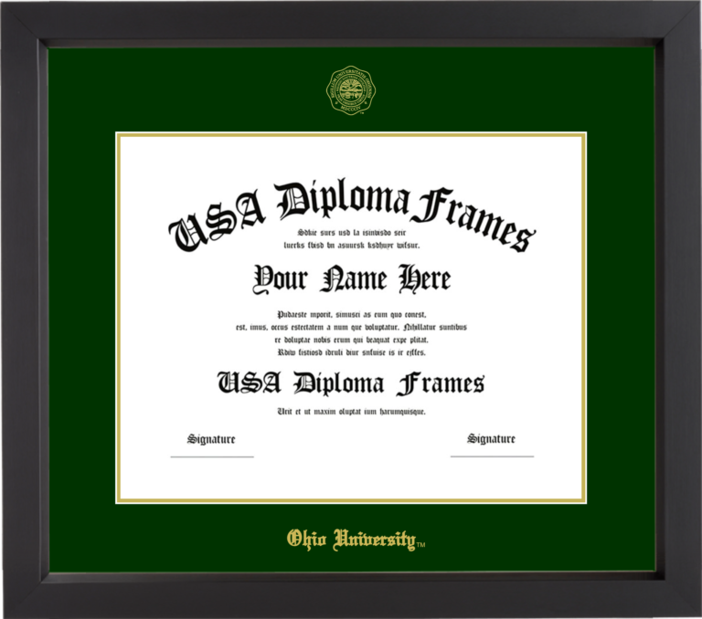 Ohio University Diploma Frame – Black Matte – Winter Green and Gold Mat