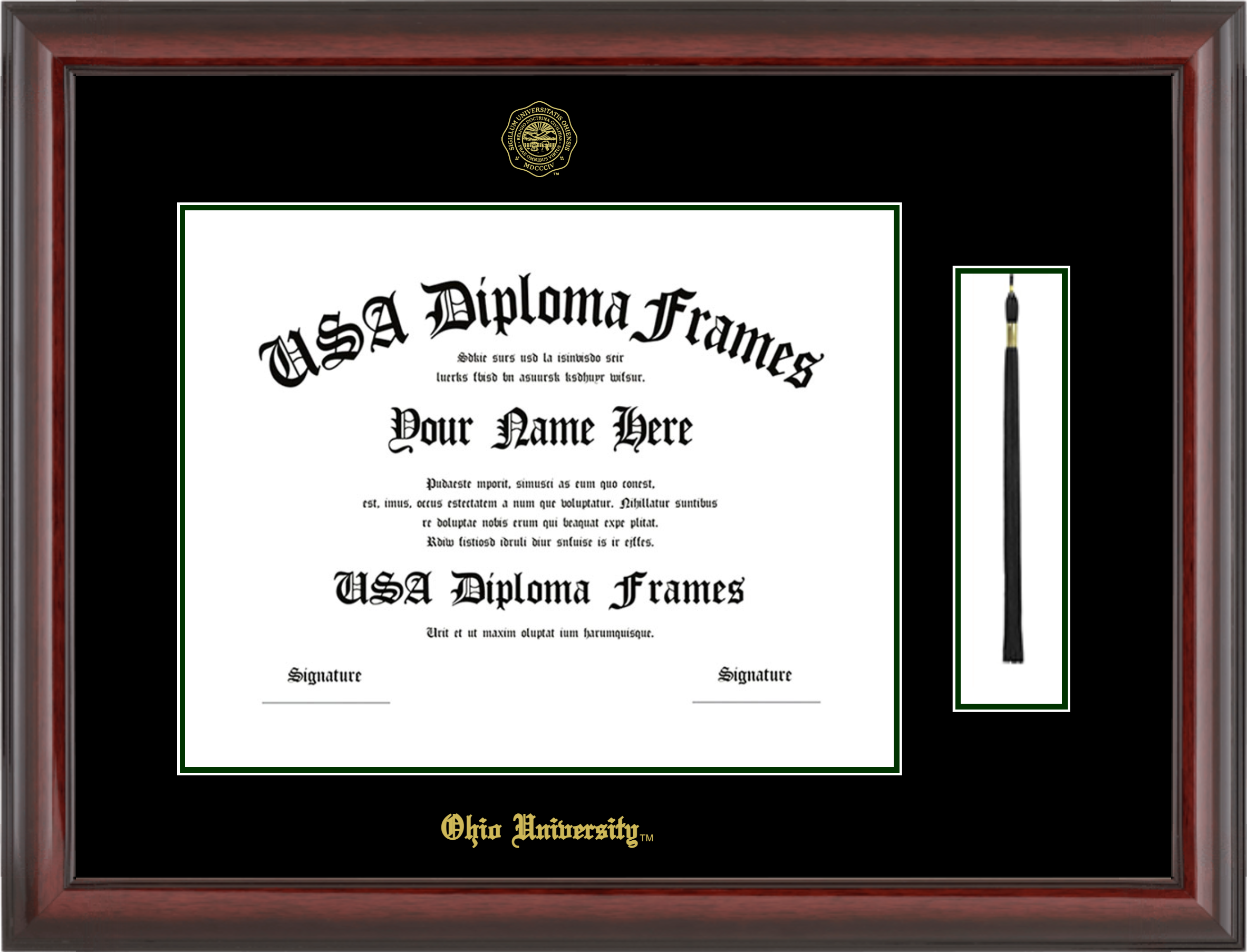 Ohio University Diploma Frame with Tassel – Cherry Mahogany Glossy – Black and Winter Green Mat – Gold Seal