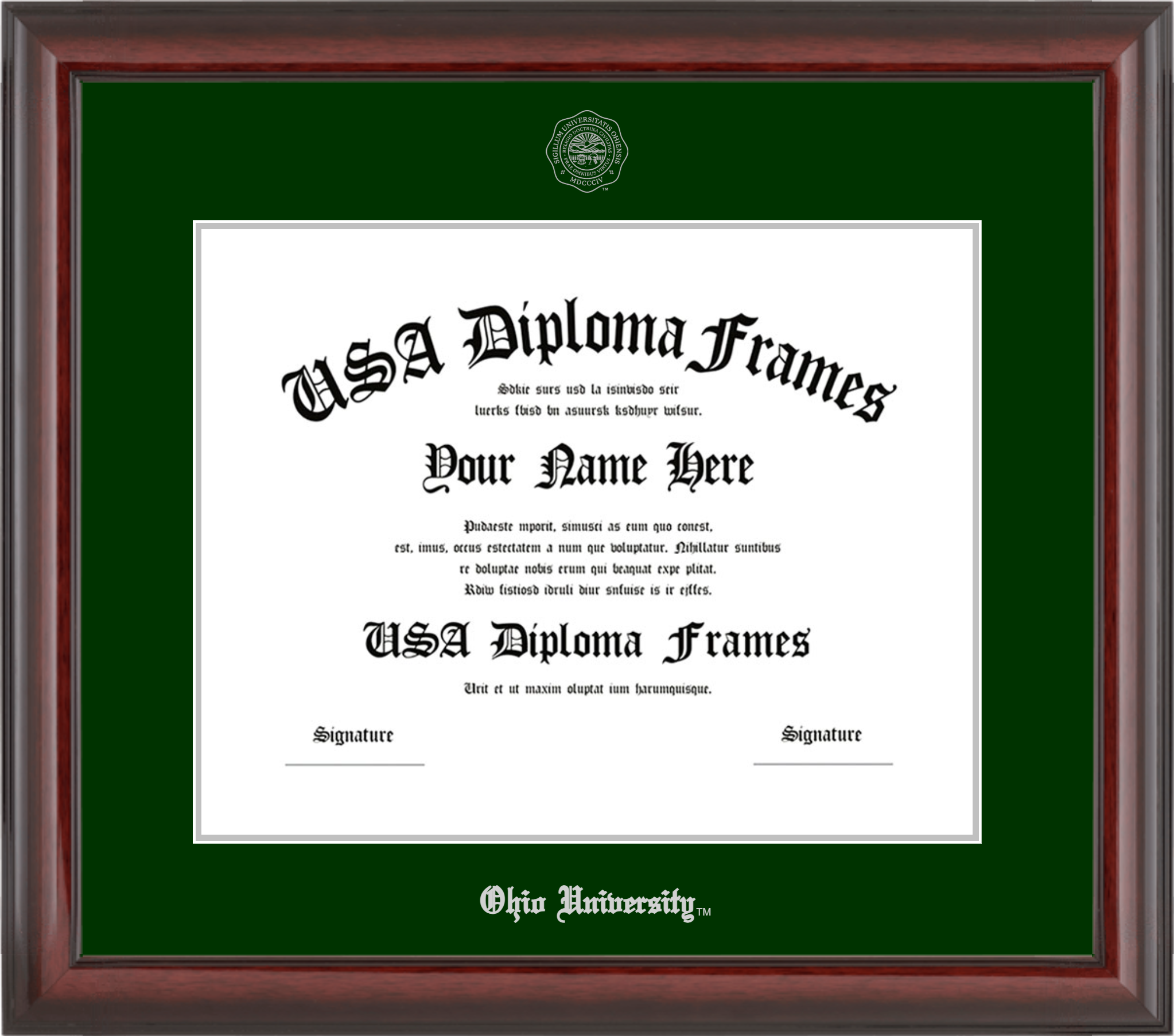 Ohio University – Single Horizontal Document ( Bachelors ) – Cherry Mahogany Glossy – Winter Green Mat – Silver Accent Mat – With Seal(University Seal Silver) – With Silver Embossing (Ohio University)