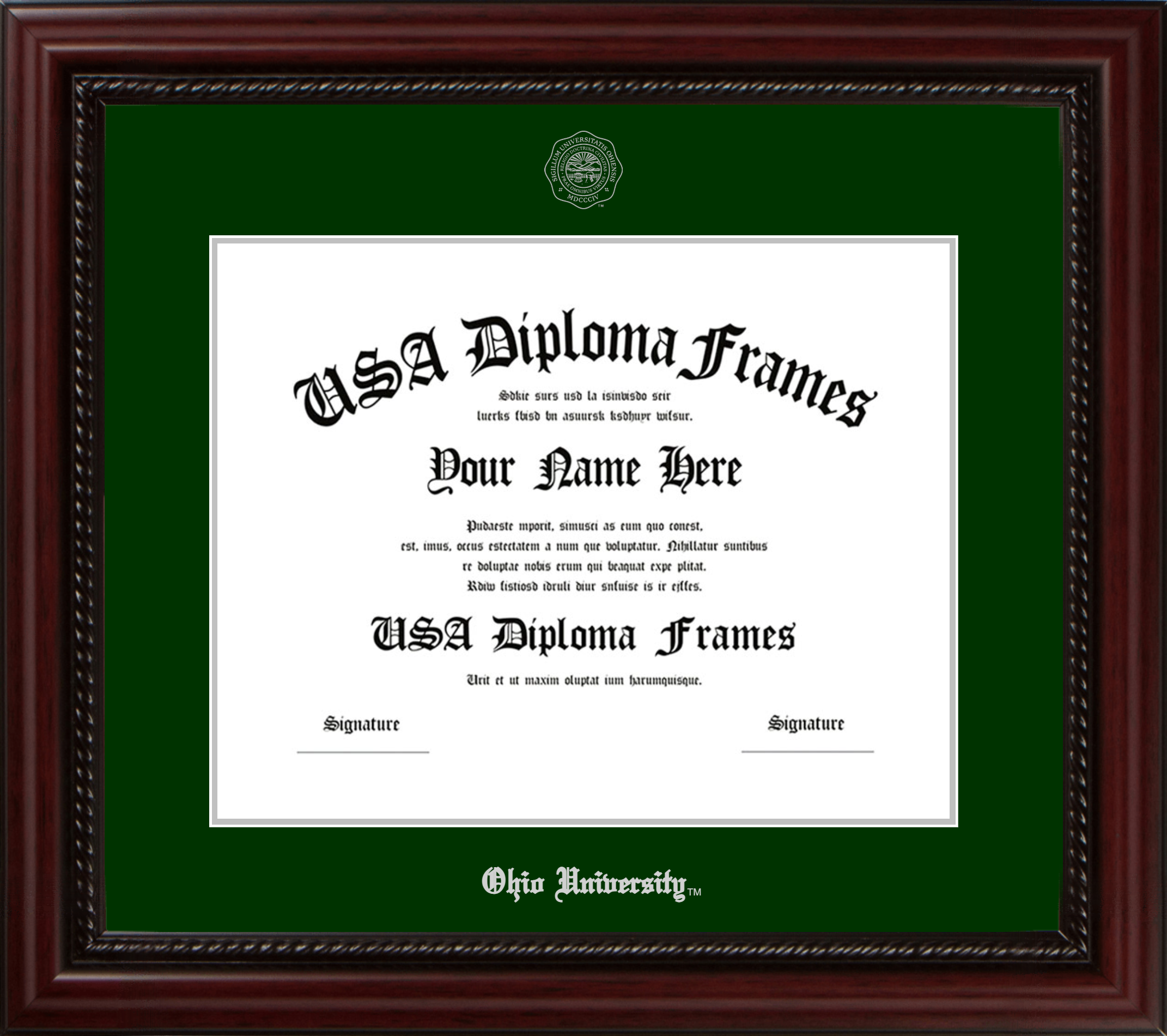 Ohio University Diploma Frame – Executive Cherry Rope – Winter Green and Silver Mat
