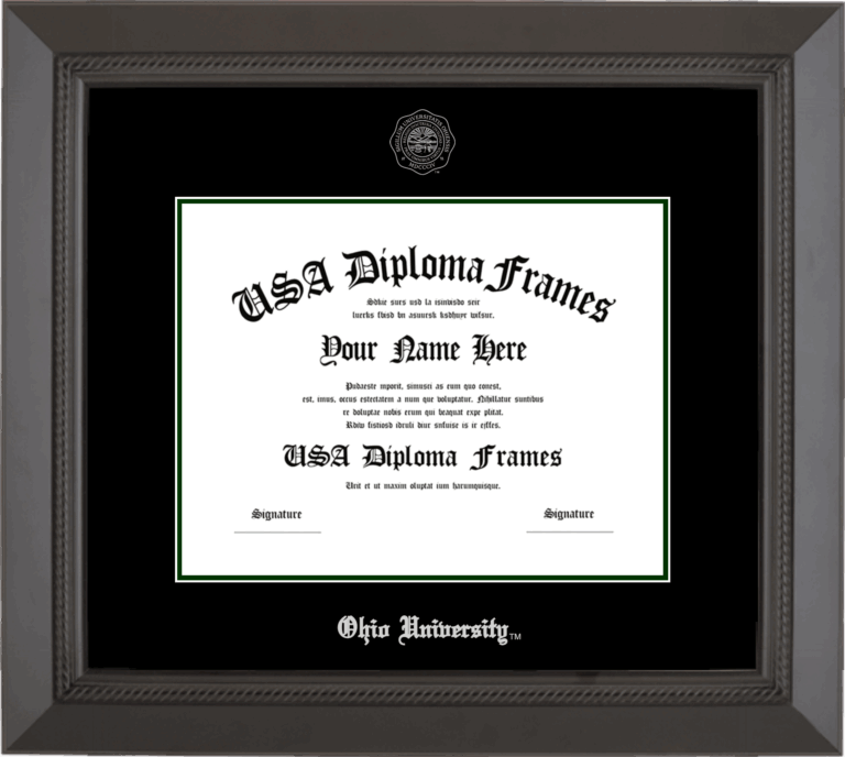 Ohio University Diploma Frame – Black Rope – Black and Winter Green Mat – Silver Seal