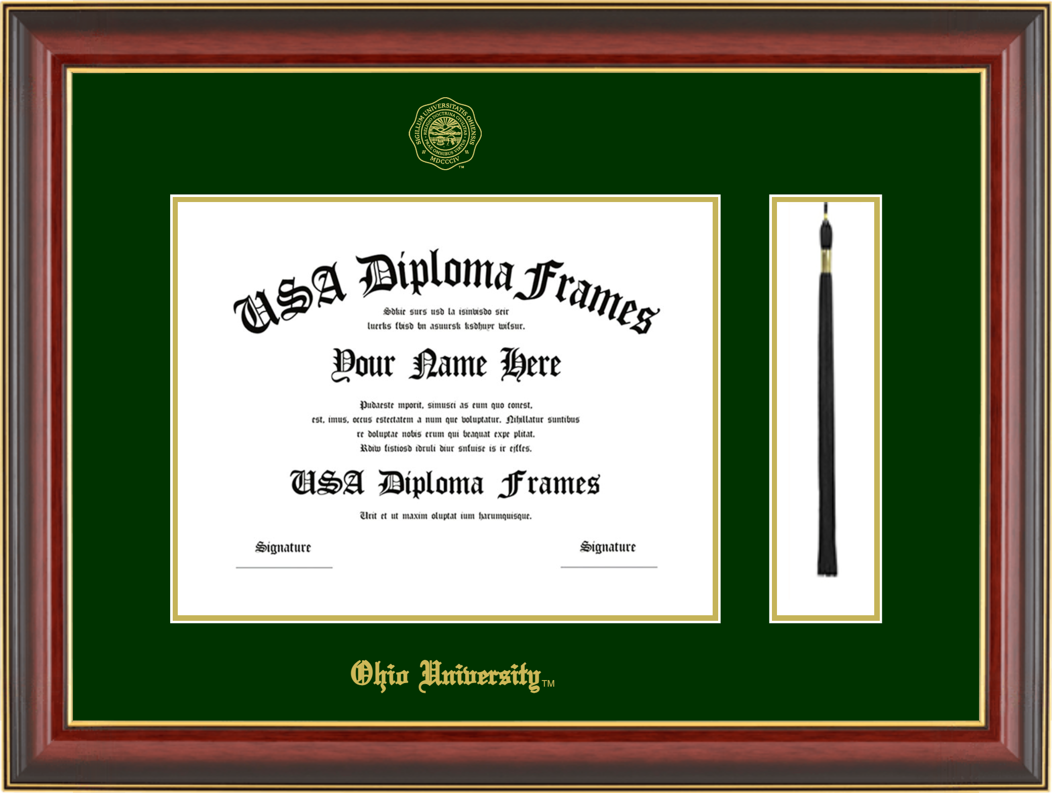 Ohio University Diploma Frame with Tassel – Cherry Mahogany Gold Trim Glossy – Winter Green and Gold Mat